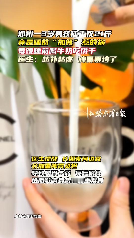 “万万没想到!”河南郑州,一男孩为了补充营养,每晚睡前都要喝牛奶吃饼干,不料男孩越补越虚,3岁的他身高不足90公分,体重只有21斤,去医院一看,才知道男孩长期夜间进食,给脾胃“累垮了”,最终确诊为营养不良!