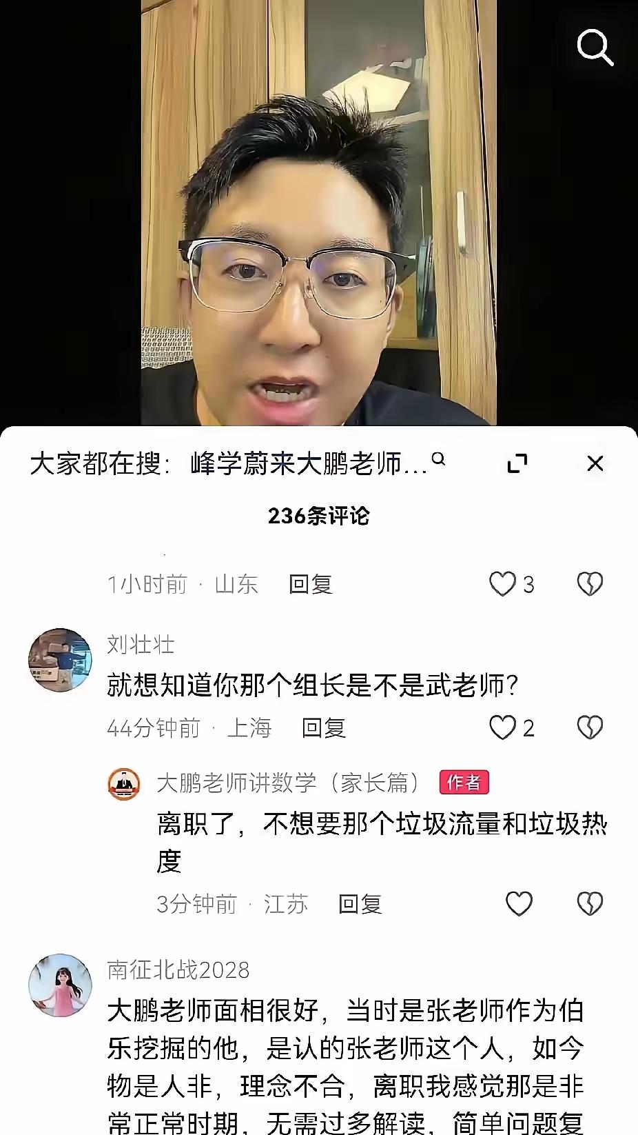 峰学蔚来团队的大鹏老师辞职了。武亮老师,小郭老师,邵老师,大雷老师,他们接替一下张老师,用心血浇灌的公司。只有大鹏老师选择在这个时候辞职,并且说他不要什么垃圾流量,垃圾热度。就凭他说的这句话,就显得没格局。流量和热度,又不是谁炒起来的。是网友们对张老师的怀念,是对峰学蔚来的肯定。