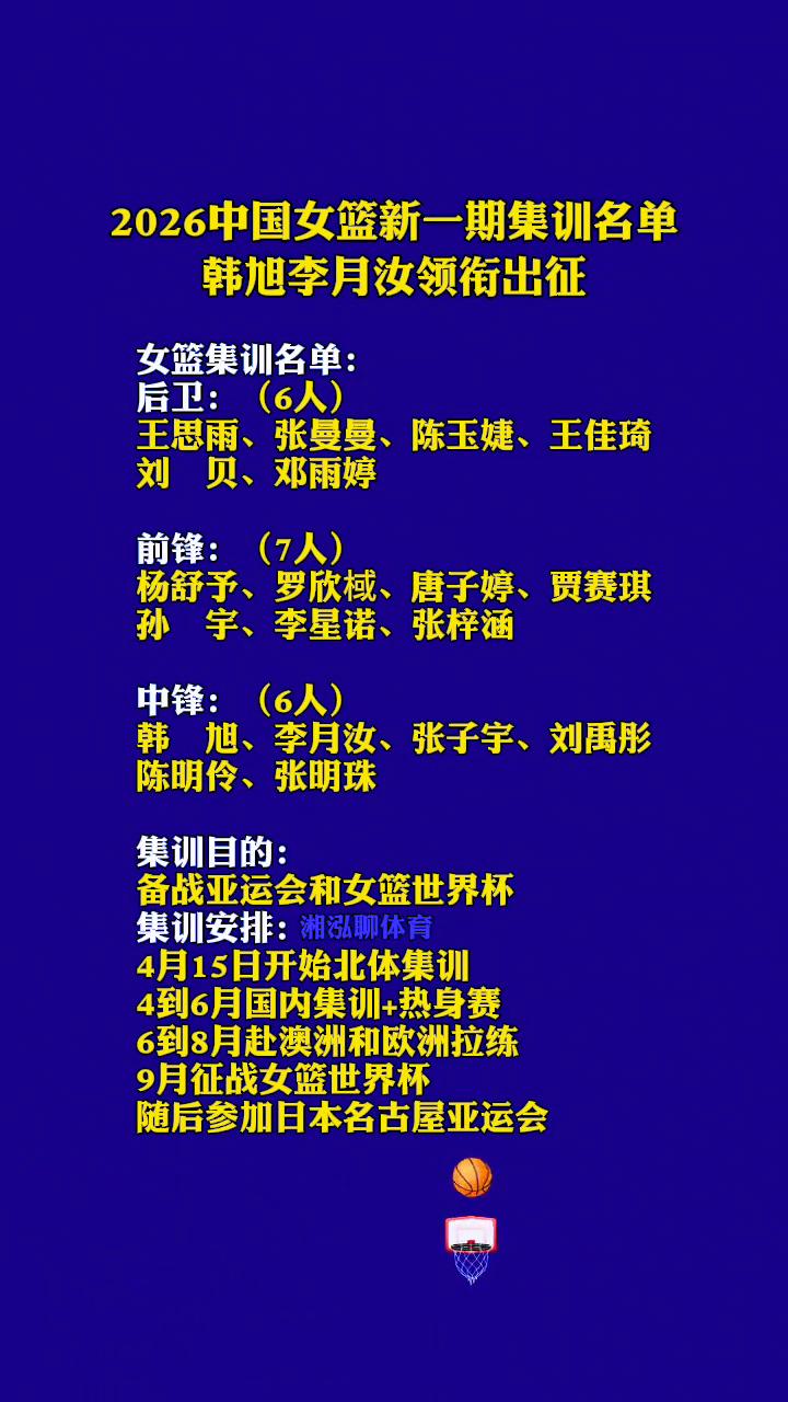 2026中国女篮新一期集训名单,韩旭、李月汝领衔出征。