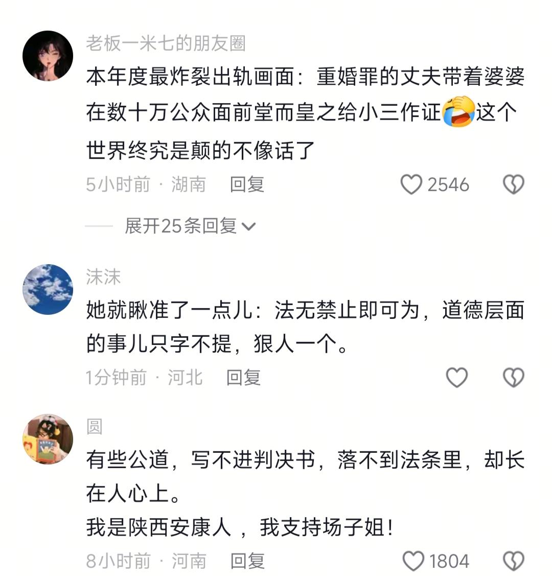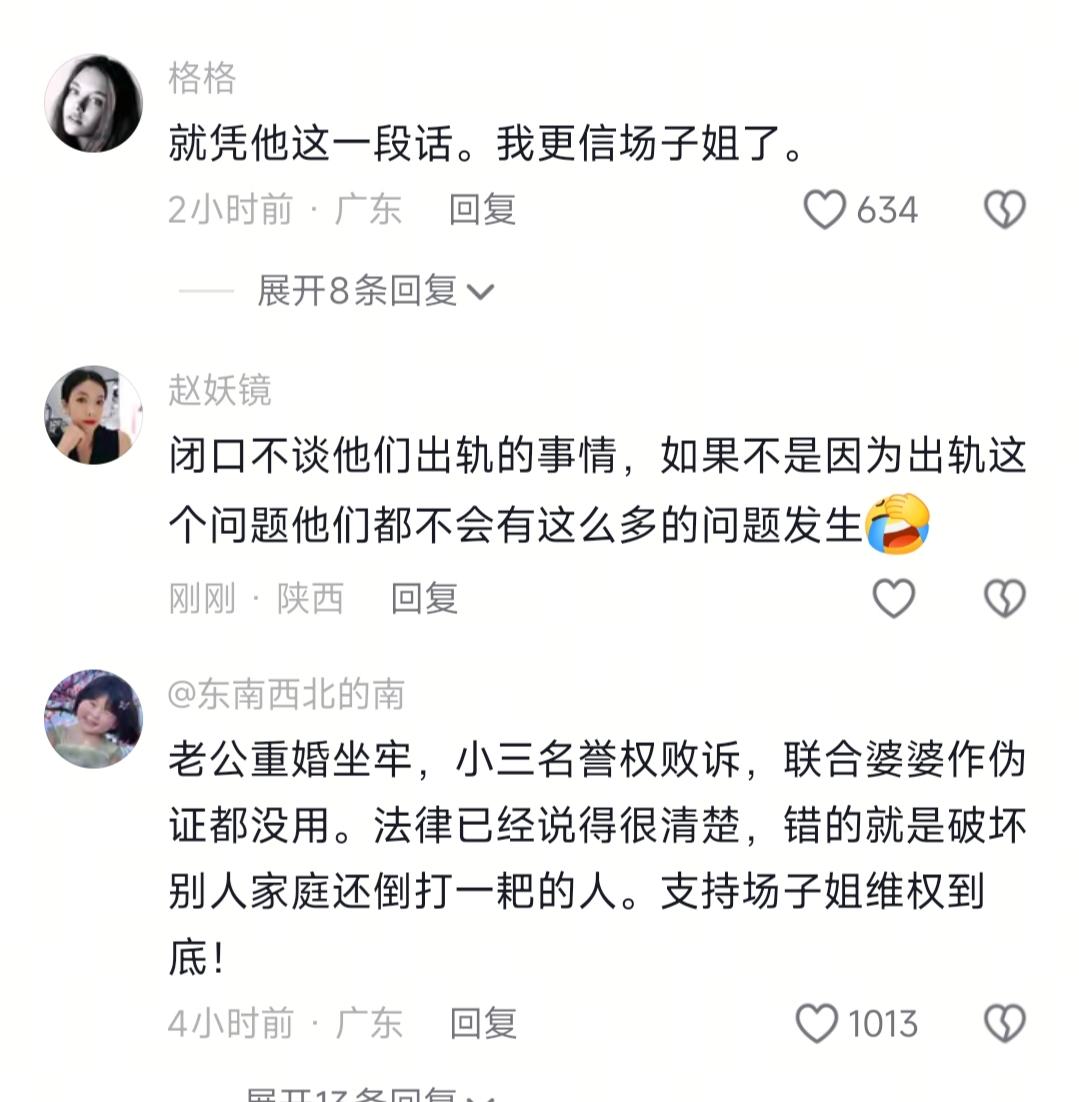老实讲,我本来以为大家都会一边倒骂渣男小三,结果居然还有人说场子姐是在蹭流量,私人纠纷不该占用公共资源。随便吧,可能是吧,反正我是站场子姐的。