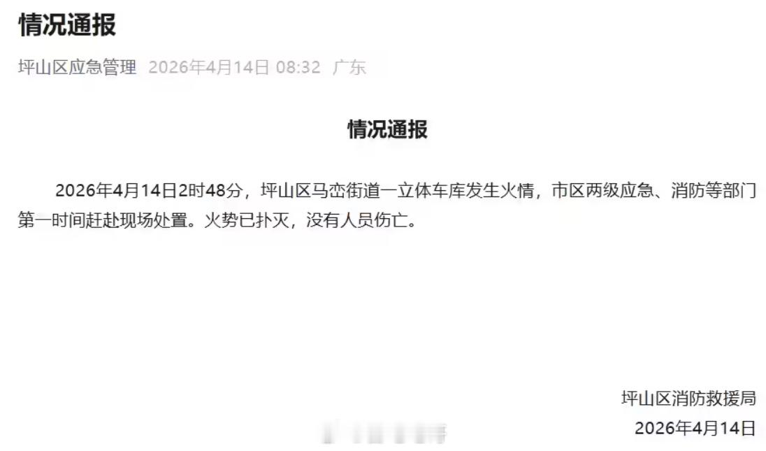 4 月 14 日消息,针对网传深圳坪山比亚迪工厂着火一事坪山区消防救援局今日发布情况通报:2026 年 4 月 14 日 2 时 48 分,坪山区马峦街道一立体车库发生火情,市区两级应急、消防等部门第一时间赶赴现场处置。火势已扑灭,没有人员伤亡。