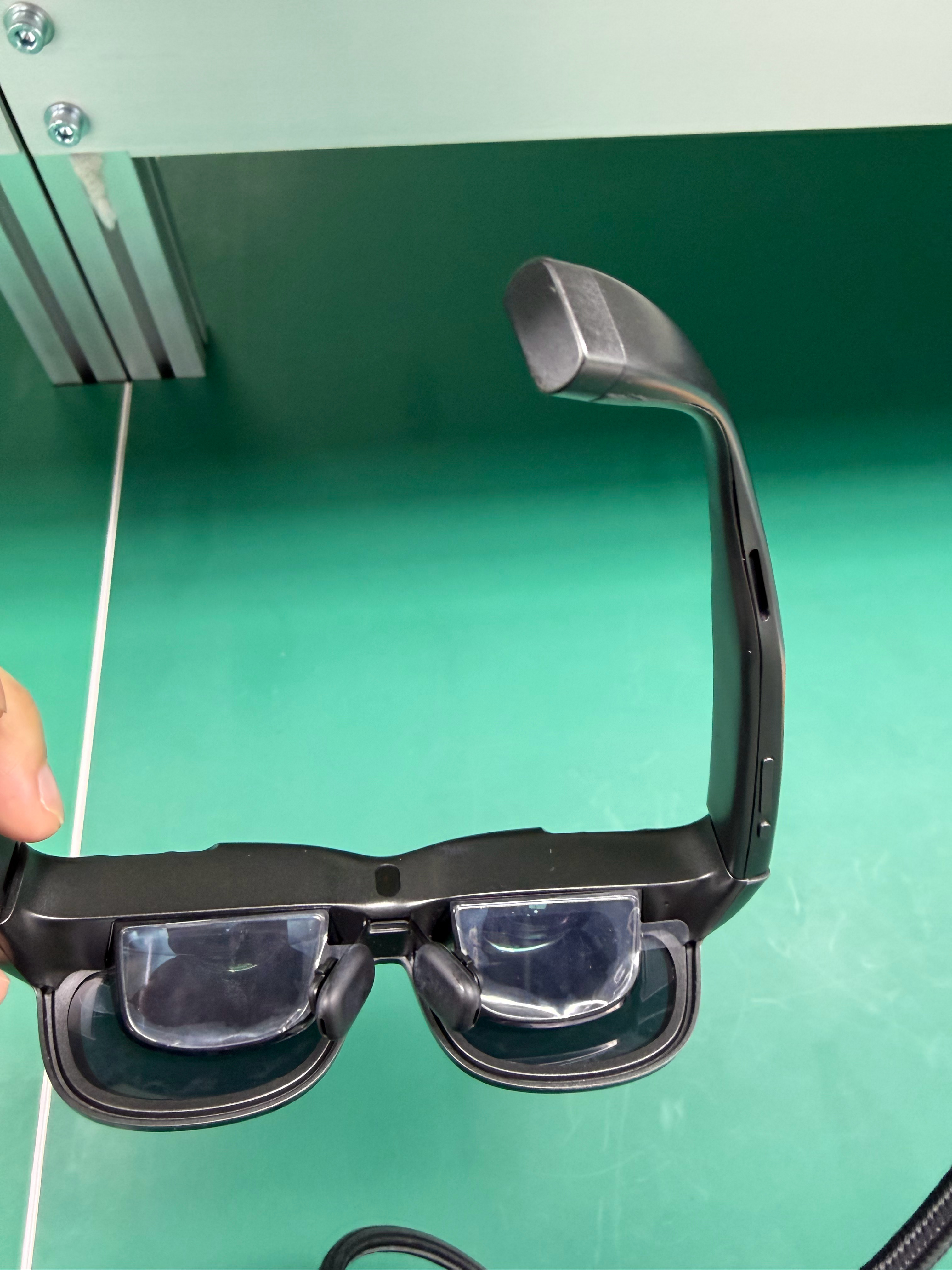 这是一副眼镜,和手机连接,戴上以后,可以把手机里的图像传递到眼镜上来看,就是你通过这个眼镜可以看到手机屏幕,镜架上还有耳机,不过屏幕不能放大我说,你这个解决了大问题,从此以后我可以躺着看手机了。定价两千左右,你会买吗?