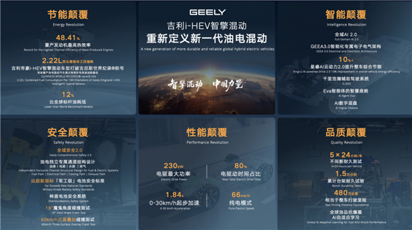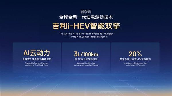 吉利发布新一代i-HEV智擎混动技术,搭载全球量产热效率最高(48.41%)的自研发动机,获吉尼斯认证2.22L/100km超低油耗(低于踏板摩托车)。