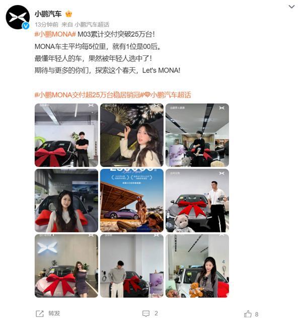小鹏MONA M03累计交付突破25万台,其中每5位车主就有1位是00后,成为年轻人首选的智能运动轿车。2026款售价11.98–15.18万元,以高性价比持续领跑A级纯电市场。