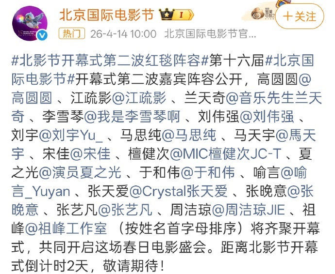 张晚意官宣加盟北影节 张晚意官宣第十六届北京国际电影节!期待优秀的青年演员,4月16日红毯见张晚意官宣北影节开幕式