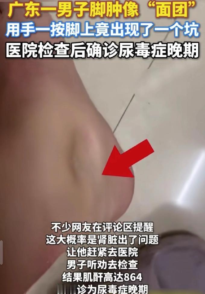 广东,一位外卖小哥送完单子觉得脚疼,回家后用手一摁,脚上竟然出现一个小坑,小哥不理解,就发到网上求助,网友看后认为是肾出了问题,立刻让他去医院检查,结果小哥一查真发现了问题,确诊尿毒症晚期