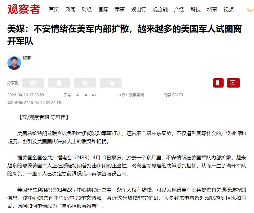 这些军人也可怜,本来想保卫国家,结果被卷进不义之战,换谁都想逃。只要特朗普还执意打伊朗,美军的不安就不会停,想离开的人只会越来越多——没人愿意拿自己的命,替别人的错误买单。