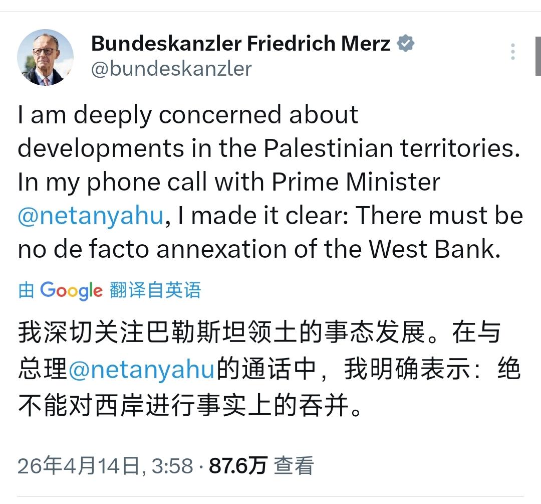 德国总理默茨今天(北京时间4月14日)写道:“我深切关注巴勒斯坦领土的事态发展。在与以色列总理内塔尼亚胡的通话中,我明确表示:绝不能对西岸进行事实上的吞并。”