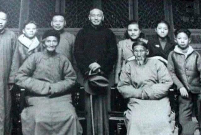 端坐的两位长者,左侧是蒋介石的亲舅舅,右侧是蒋介石的舅母(舅妈),据史料记载,蒋介石8岁丧父,家境贫寒,舅母曾视他如己出,接济米粮、协助操办婚事,甚至变卖家产支持他赴日留学,这份恩情贯穿了蒋介石的一生。