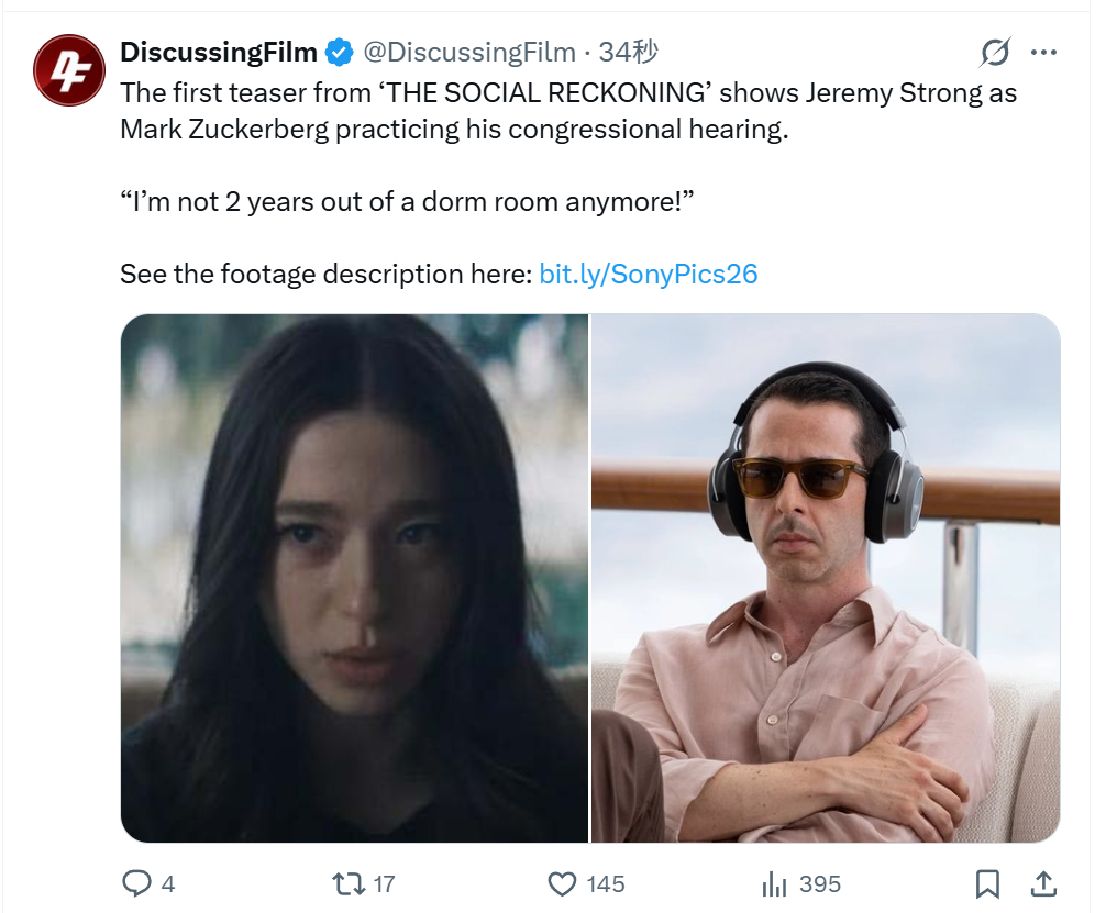 TNABO 索尼在CinemaCon推介大会上展示了艾伦·索金“社交网络”续集《社交清算》的预告,杰瑞米·斯特朗饰演的马克·扎克伯格获得现场力赞——“这角色怕是真能搞垮互联网”