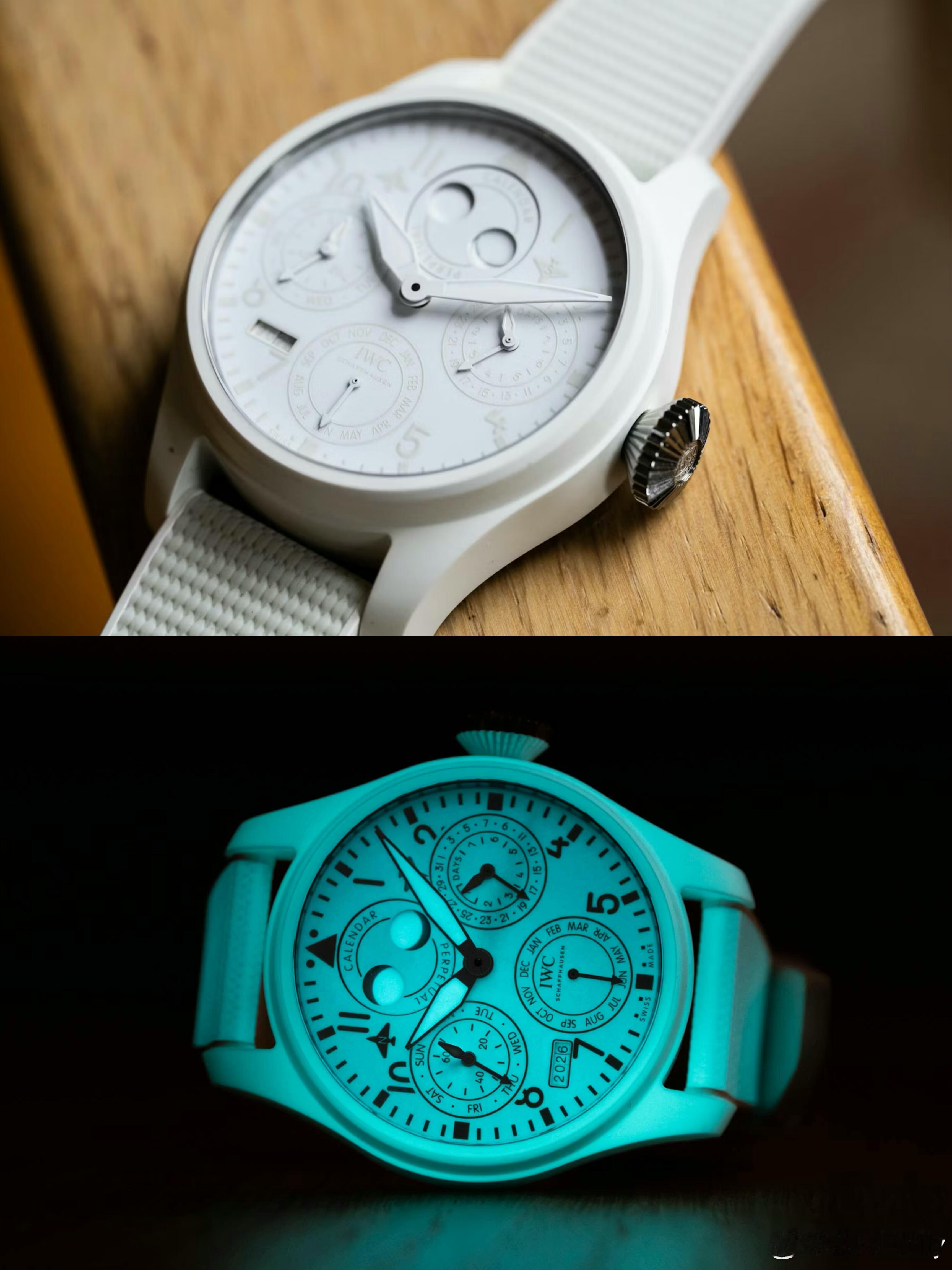 钟表与奇迹2026 万国把整个夜空戴在你手腕上。在万国2026新款上黑科技了!在钟表与奇迹2026”,IWC直接把科幻片搬进现实:全夜光表壳 + 万年历机芯 + 46mm大飞外壳,这一次,不只表盘会亮——表壳、表圈、甚至表耳,整块表都在夜里发光。这就是万国全新Ceralume夜光瓷黑科技:陶瓷粉混入Super-LumiNova,吸光后能在黑暗里持续发出蓝光超过24小时。白天看,它是沉稳霸气的飞行员工具表;黑夜中,它就是一颗悬浮在腕间的蓝色发光体。经典46mm大飞行员壳型,搭载复杂的万年历机芯,却用上了未来感的“自发光材料”。传统制表工艺 × 前沿材料科学,这块表算是把万国现阶段最强的技术一次集齐了。别人只是夜光表盘,它是整只表在发光。高手带路看表展钟表与奇迹制表工艺