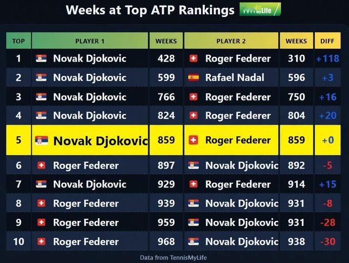 本周,在ATP世界排名前5的时长上, 德约科维奇和费德勒的周数持平,均为859周