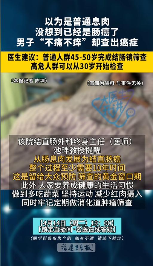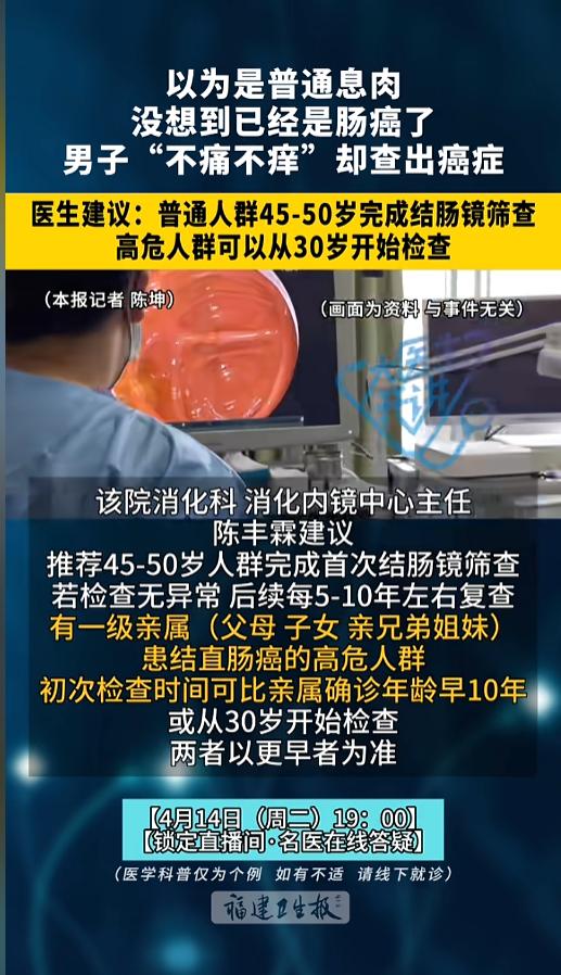 信息来源:《以为是普通息肉,没想到已是肠癌了,福建男子无症状却查出癌症 医生建议:普通人群45-50岁完成首次结肠镜筛查 ,高危人群 可以从30岁开始检查》福建卫生报