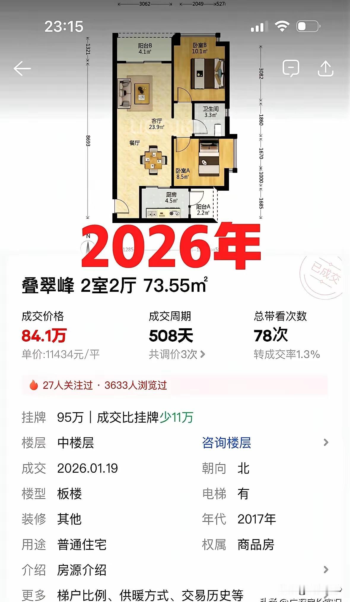 更加惊人的对比是2021年的时候成交周期只要16天带看51次,也就是说放盘2周多一点就能成交。2026年成交周期要508天,放盘了一年半多才成交。带看78次,调价3次。