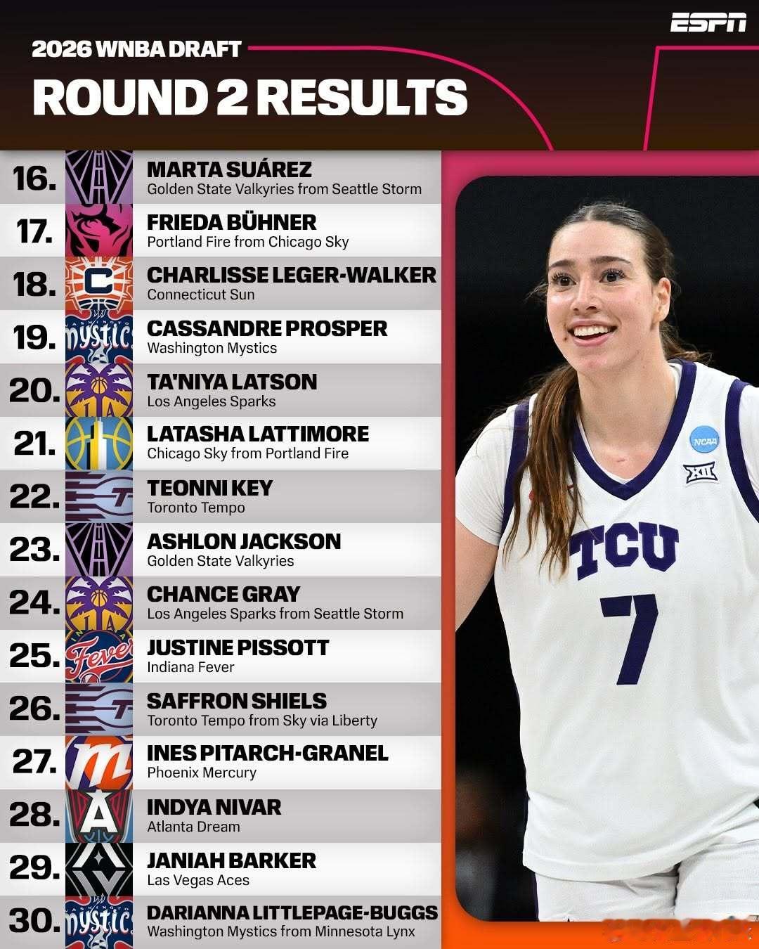 WNBA2026年WNBA 选秀大会,达拉斯飞翼用状元签选中Azzi Fudd,康涅狄格大学连续两年出品状元,校史第七位进入WNBA的状元。明尼苏达山猫用榜眼签选中Olivia Miles,西雅图风暴用探花签约选中来自西班牙的Awa Fan Thiam。冉珂嘉在第43顺位被亚特兰大梦想队选中,在去年U19女篮世界杯中表现出色。