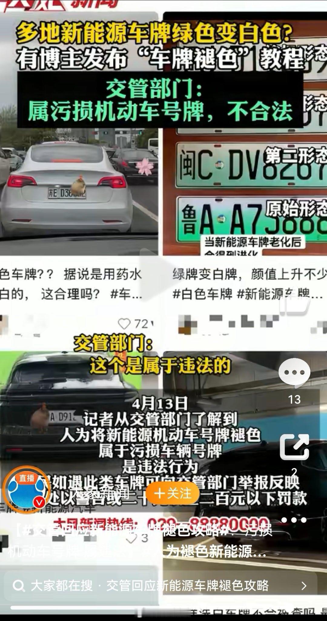 交管回应新能源车牌褪色攻略 这种所谓车牌褪色,本身就是属于污损机动车号牌,是违法行为。