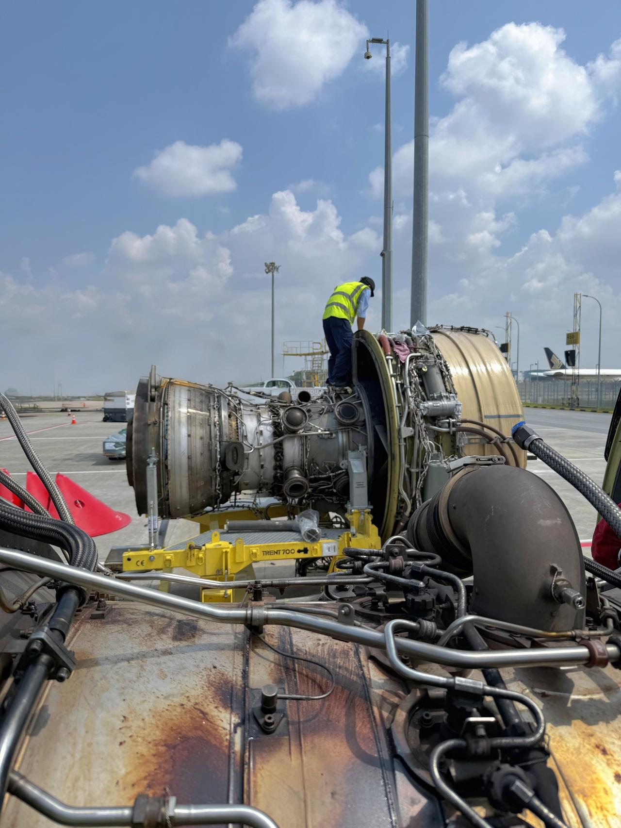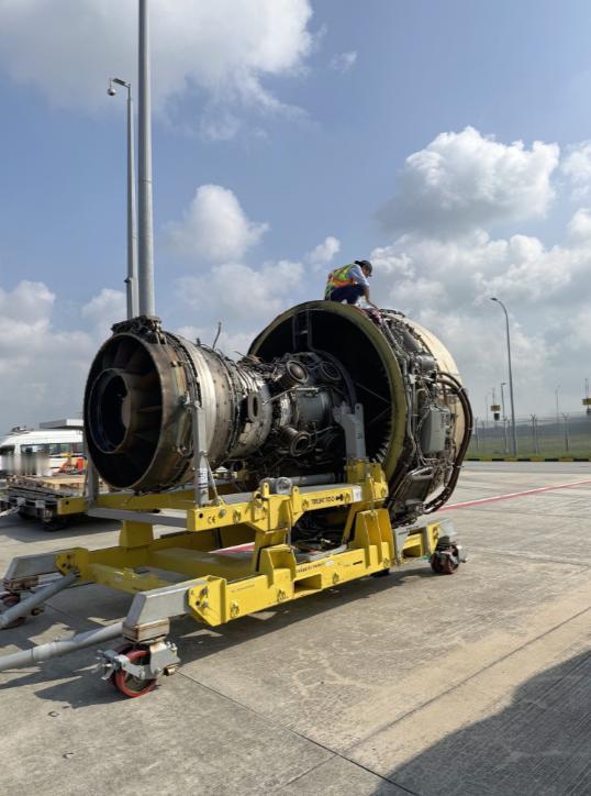 空客A330飞机在飞行中发生发动机自动关闭后更换罗尔斯·罗伊斯Trent 700发动机的现场照片。内窥镜检查发现发动机内部零件破损并出现裂纹。