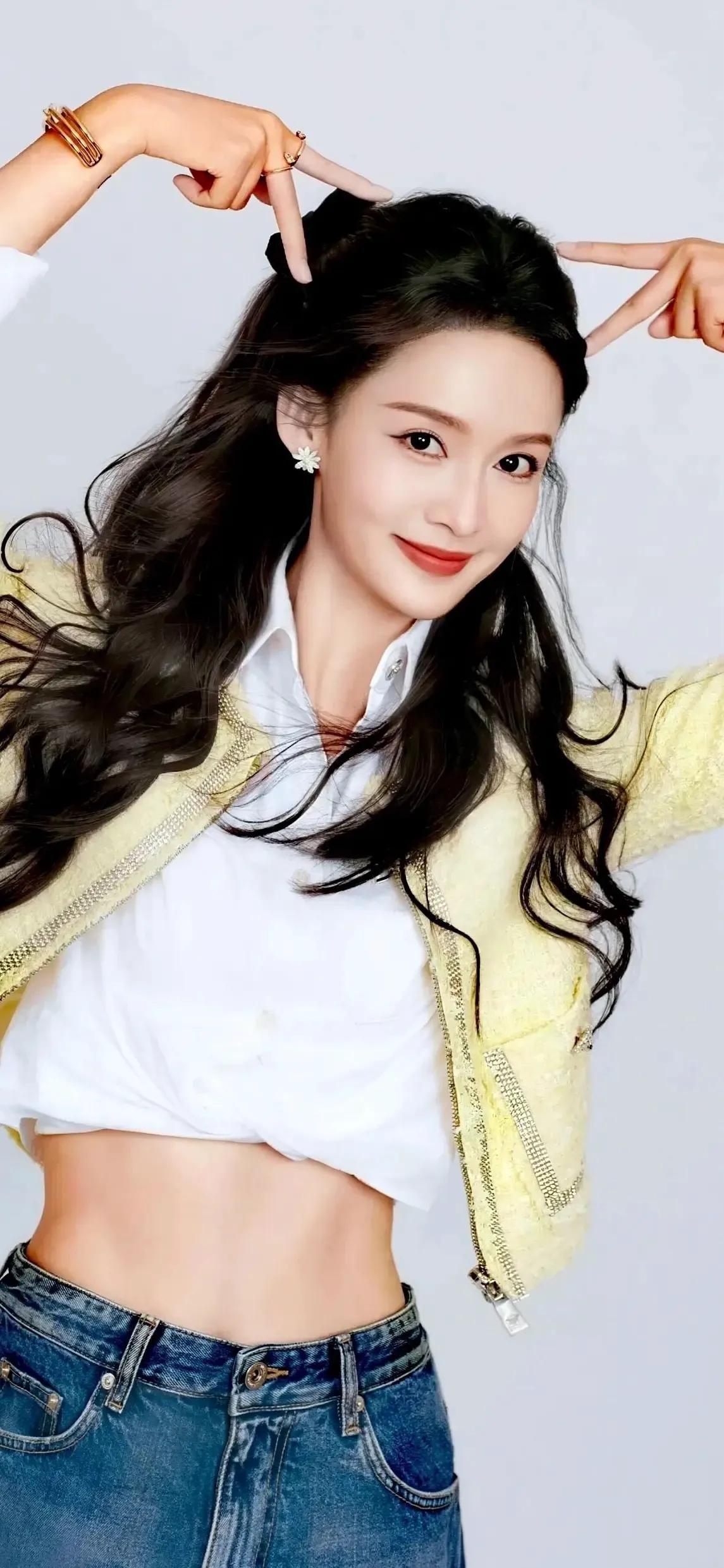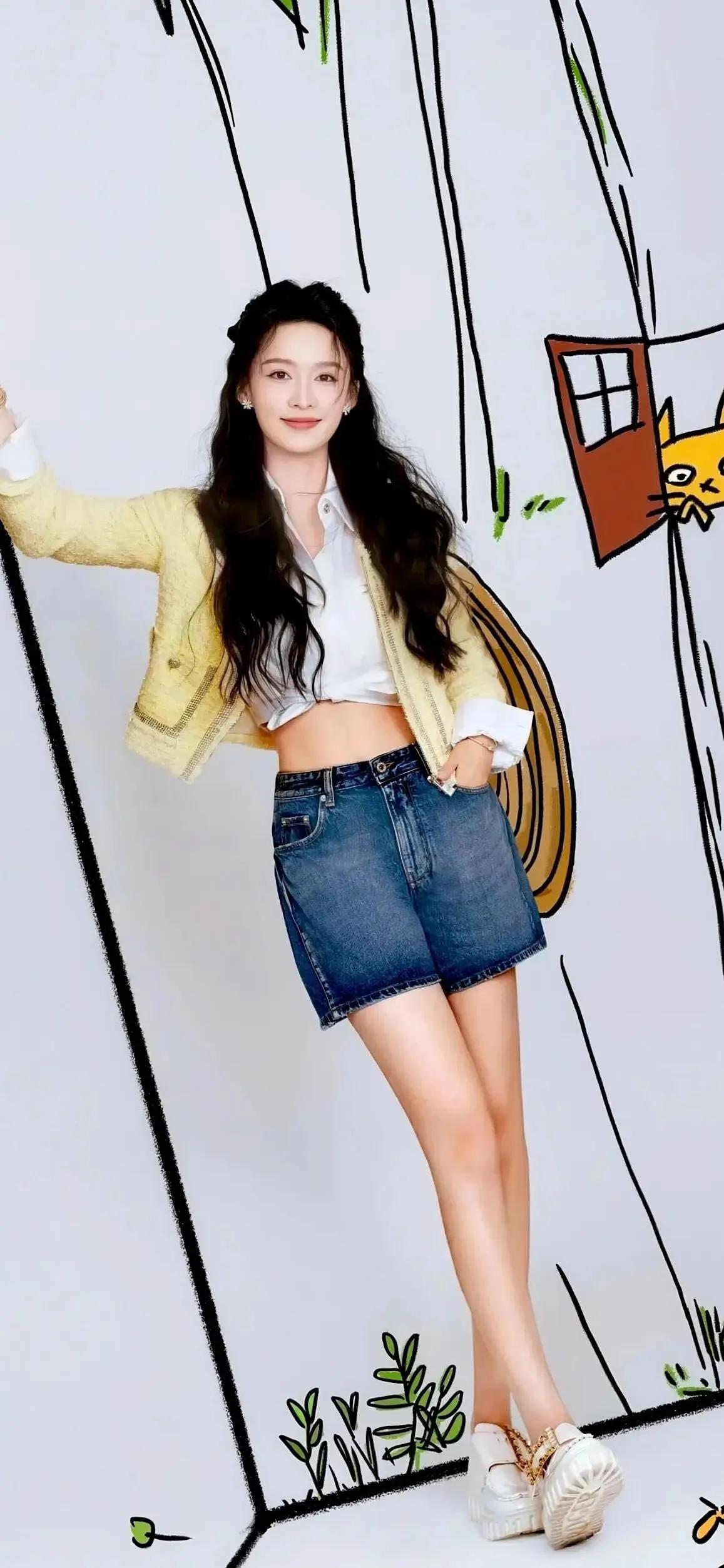 李沁身穿黄色小香风外套+牛仔短裤,真时尚减龄显气质