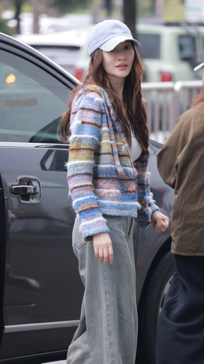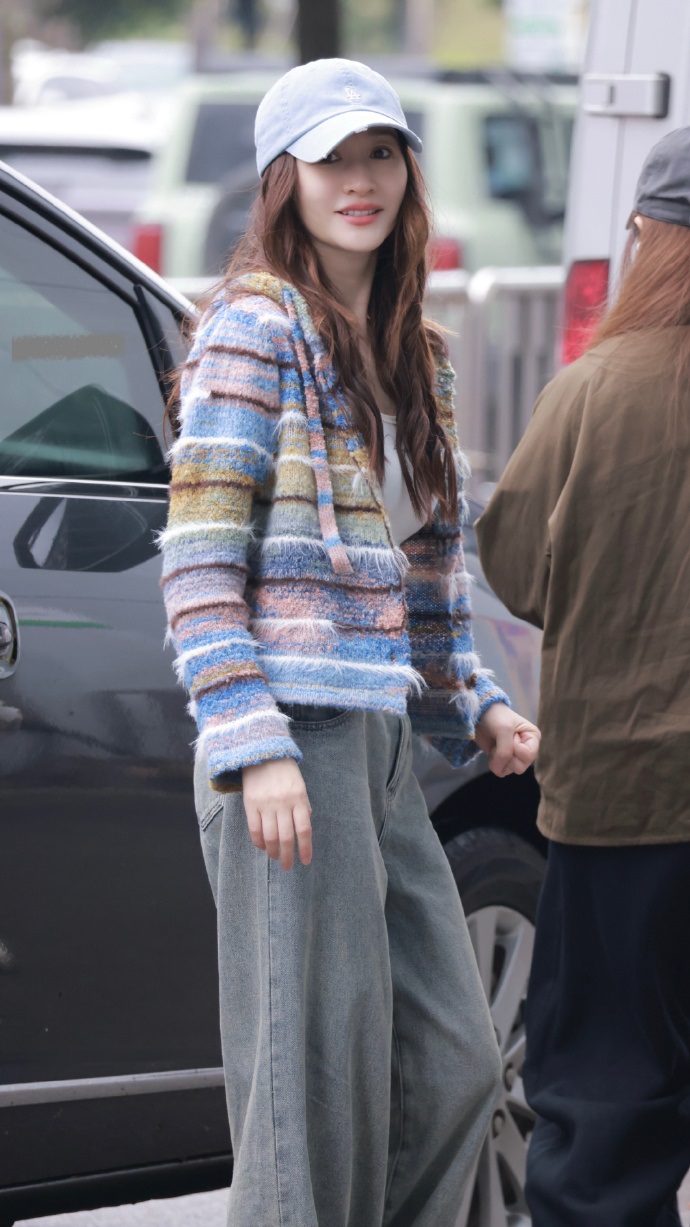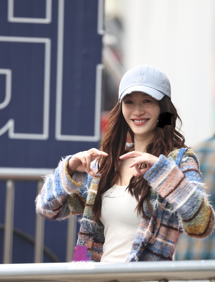 她的皮肤白里透红,眼睛发光,可见心情很不错,生活也很美满。她戴上蓝色棒球帽之后尽显潮流时尚感,效果太好了。