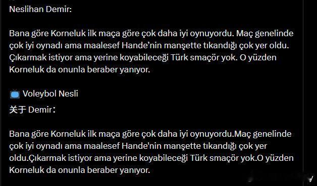 “在我看来,科内卢克相比第一场比赛已经打得好多了。她整场表现其实相当不错,但问题是汉德(巴拉丁)在一传环节多次卡壳。教练当然想换下她,可问题是——替补席上并没有能顶上的土耳其本土主攻。所以,科内卢克也只能跟着一起“背锅”了。
