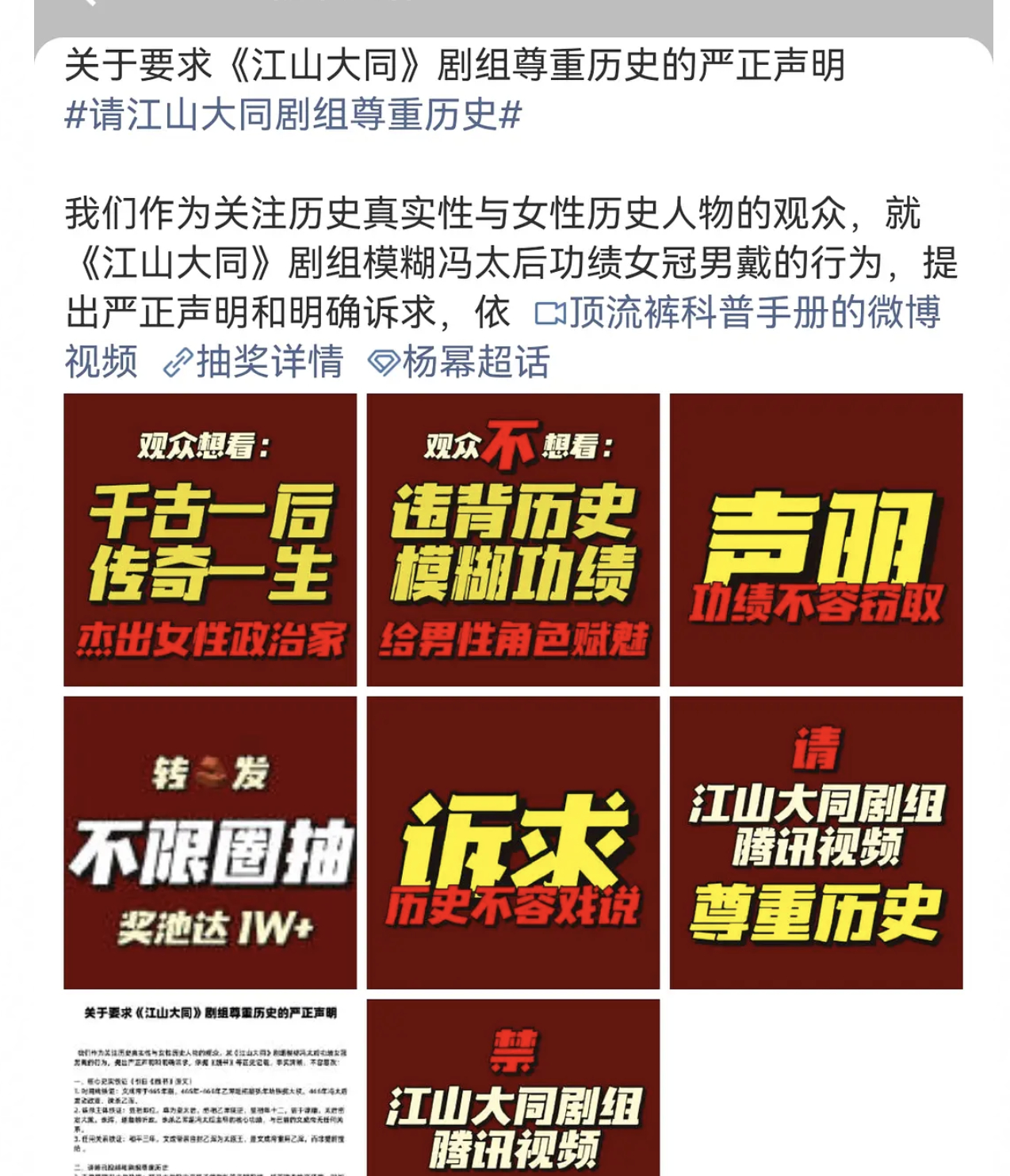 杨幂粉丝不限圈抽奖,抵制江山大同剧本模糊冯太后功绩,女冠男戴,违背历史,给男性角色赋魅,要求剧组尊重历史。