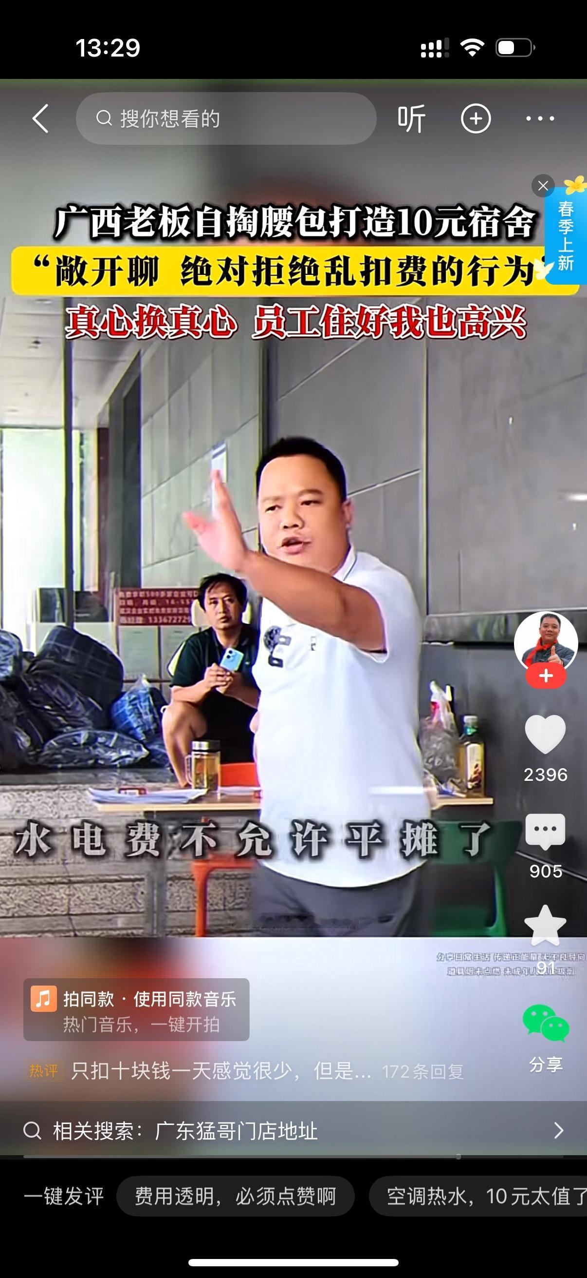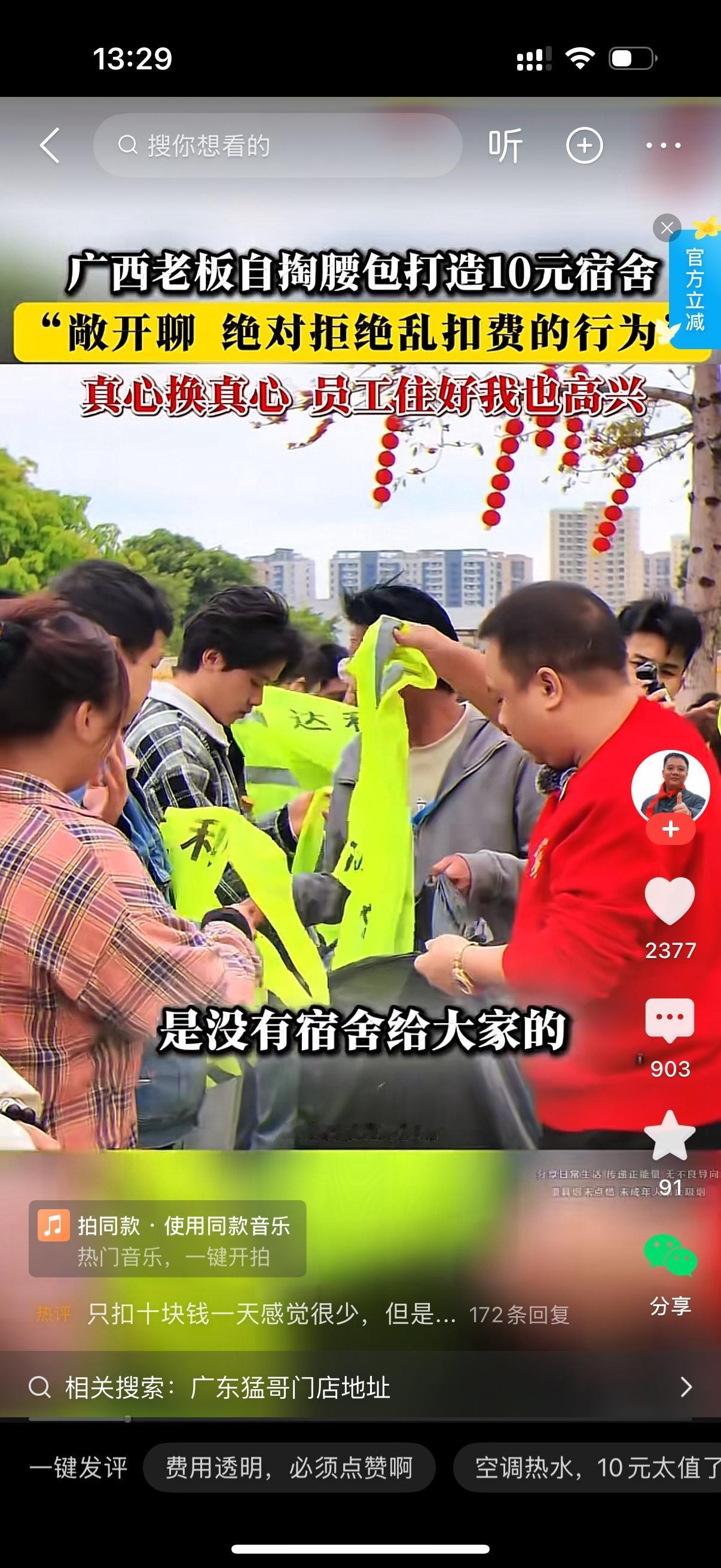 广西老板自掏腰包打造10元宿舍。他宣称,工厂是没有宿舍给大家的。这个10元一天的宿舍,自己租来的,自己装了空调,热水器,床,水电费全包。听上去好像很划算,实际上一间6个平方的宿舍住六个人,一个月就是1800。这老板讲的这么冠冕堂皇,好像很大气,其实还在薅员工羊毛。这样的宿舍在广西不值钱,一个月200就可以租到,还是一个人独享。