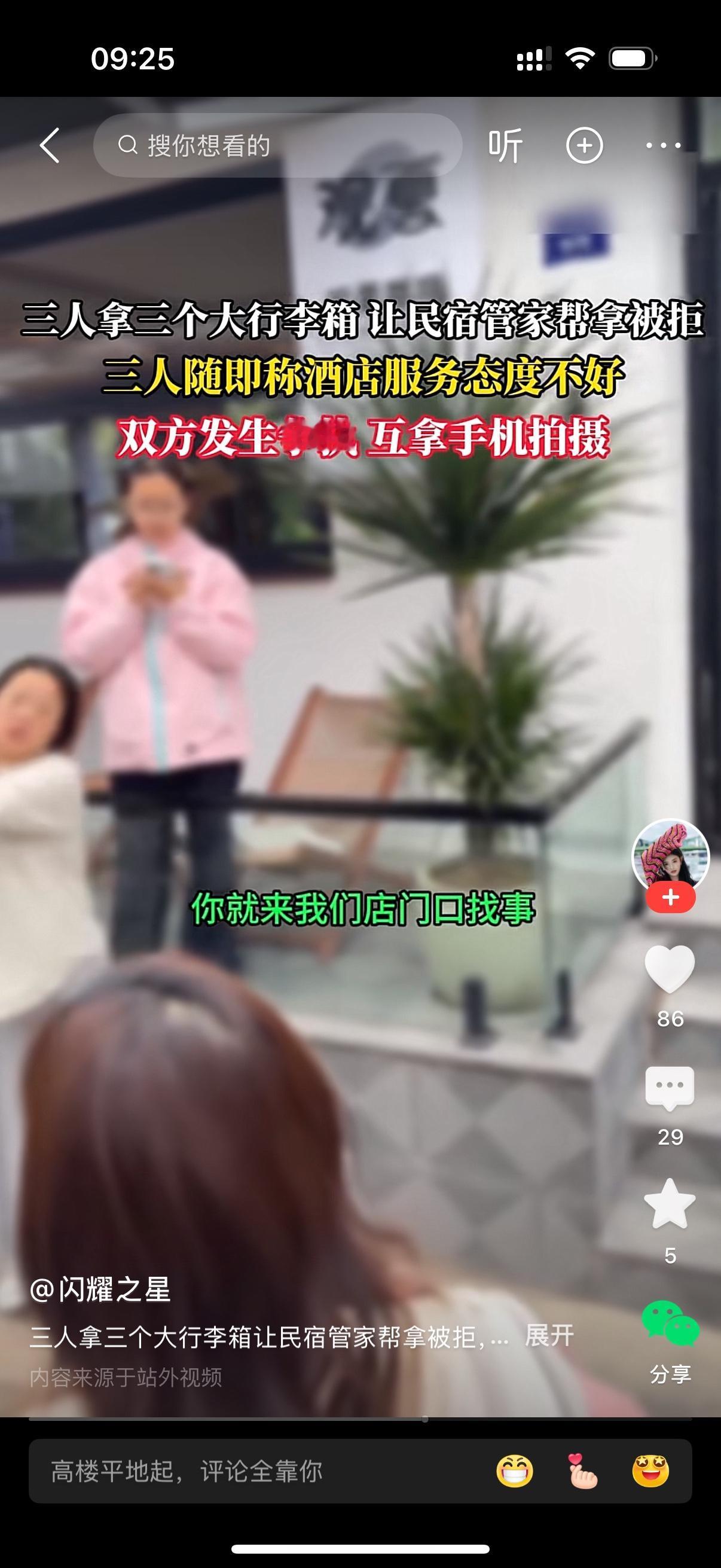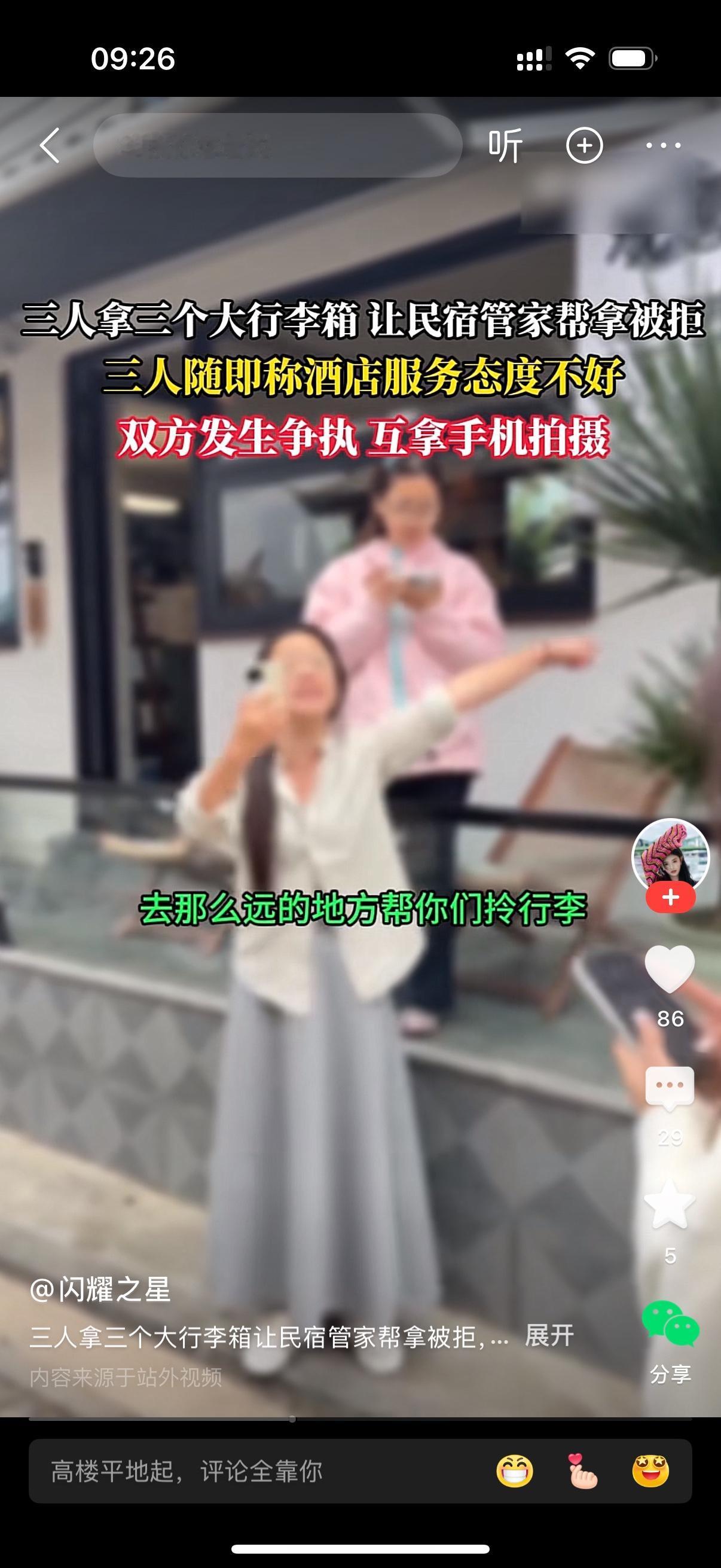 三人拿着三个大行李箱让民宿管家去帮拿,遭到拒绝。三人来到民宿门口,破口大骂。民宿