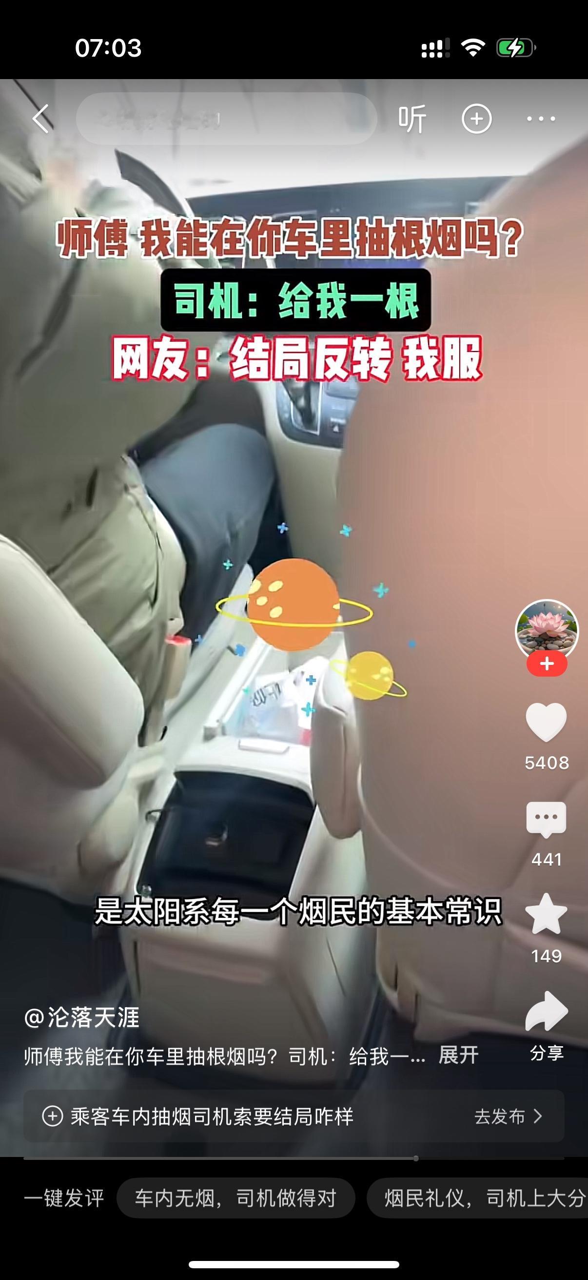 乘客问司机,师傅我能在车上抽根烟吗?司机说,给我一根。不然不然别抽。乘客说,在你车上抽烟还要给你交税吗?哎,我真的服了,我就是烟瘾犯了,想在你车上抽根烟而已。就没见过在车上抽烟还要给自己一根的。司机说,你没见过那是因为你见识少。在别人车里抽烟主动给司机一根,是太阳系每个烟民的基本常识。不给就别抽。乘客不好意思地说,我就剩一根了,咱俩一人一半行吗?司机说,我先抽。乘客心里想,你这个老六。
