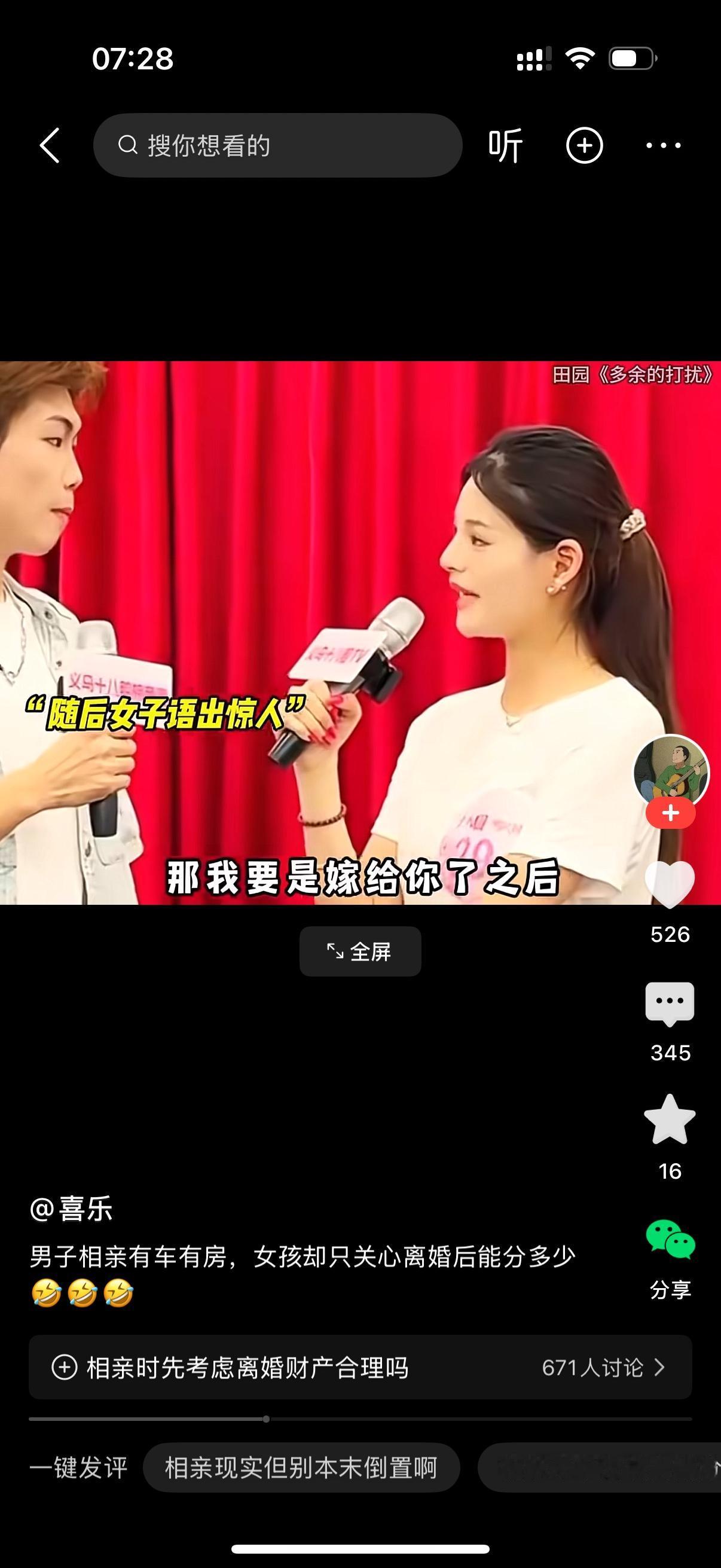 相亲现场,男人说我有房有车。女人直接问,你的房子是全款还是贷款?男子说,有贷款。女子问,那我嫁了你之后,房子可不可加上我的名字?要不然咱俩要是离了,我不是啥也得不到?男子说,怎么还没开始就想到离了?你就不能憧憬一下以后的美好生活吗?女子说,肯定还是要做好最坏的打算的。男子说,希望你找到更好的吧。女人有点失望。