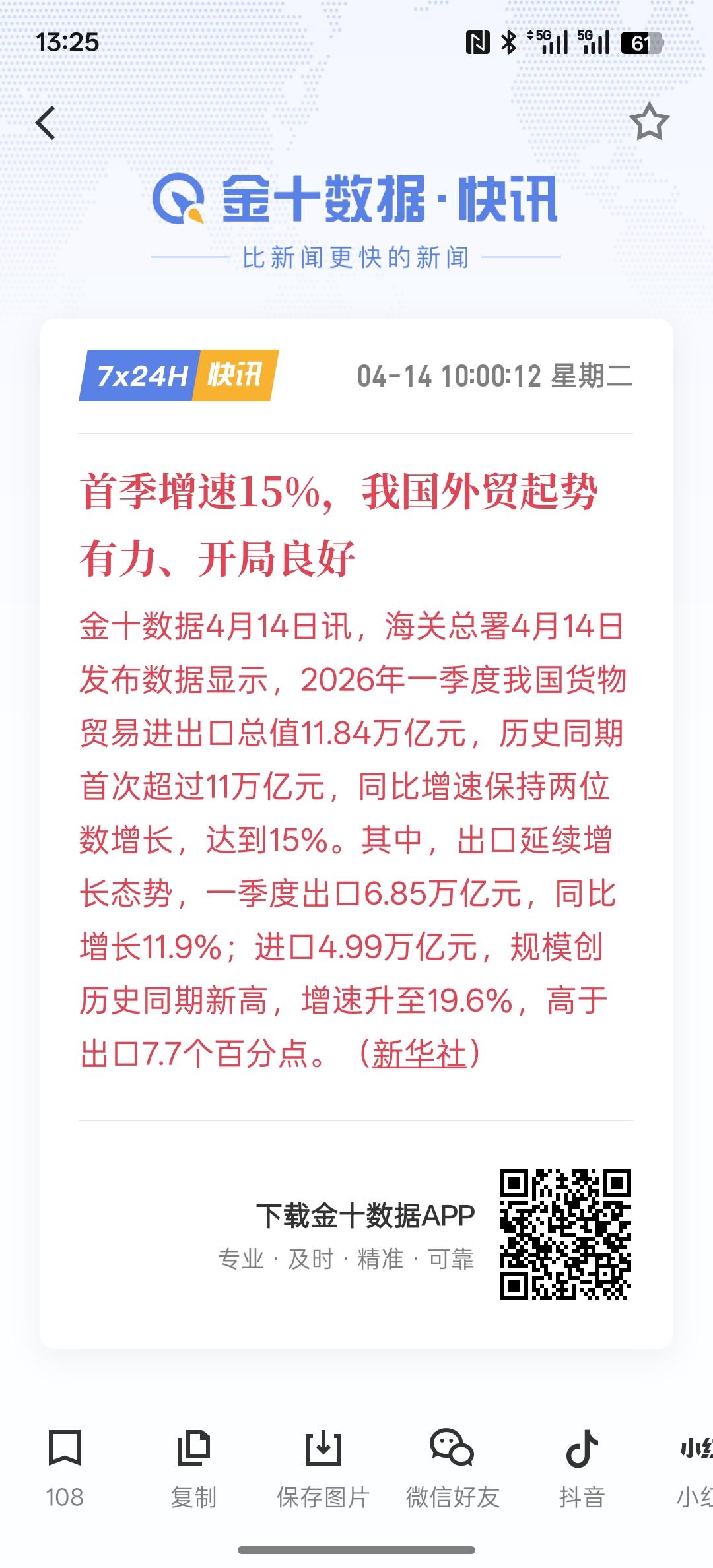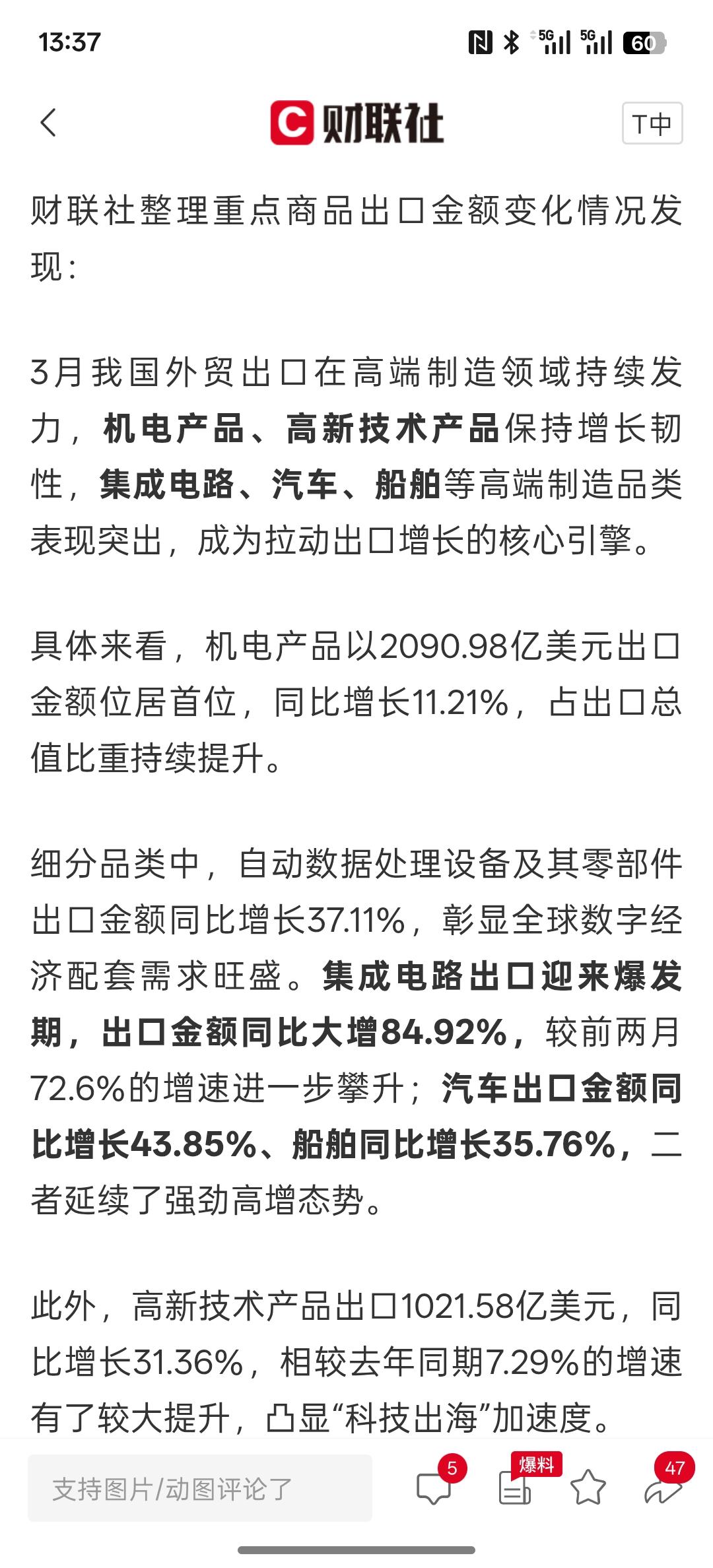三月一季度,中国的出口外贸大幅增,84.92%增速领跑!3月集成电路出口迎爆发,“科技出海”再提速,汽车的出海3月也在大幅增长。中国整体来看,经济增长的趋势是一个相对比较稳发展?