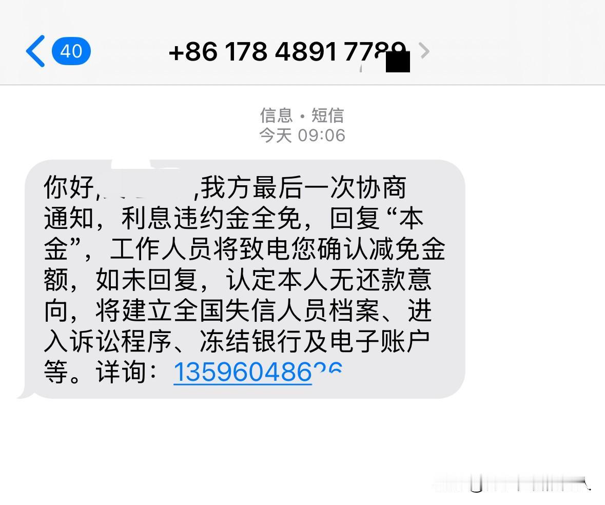 今天一大早收到两条短信,一条来自吉林长春:说最后一次协商通知,利息违约金全免,回复“本金”就行。