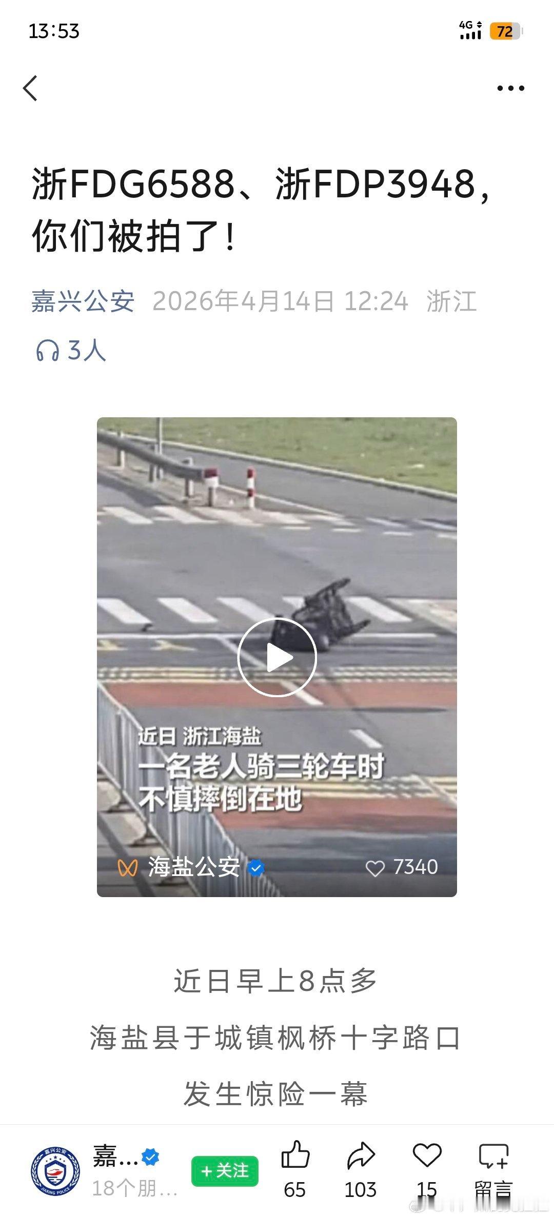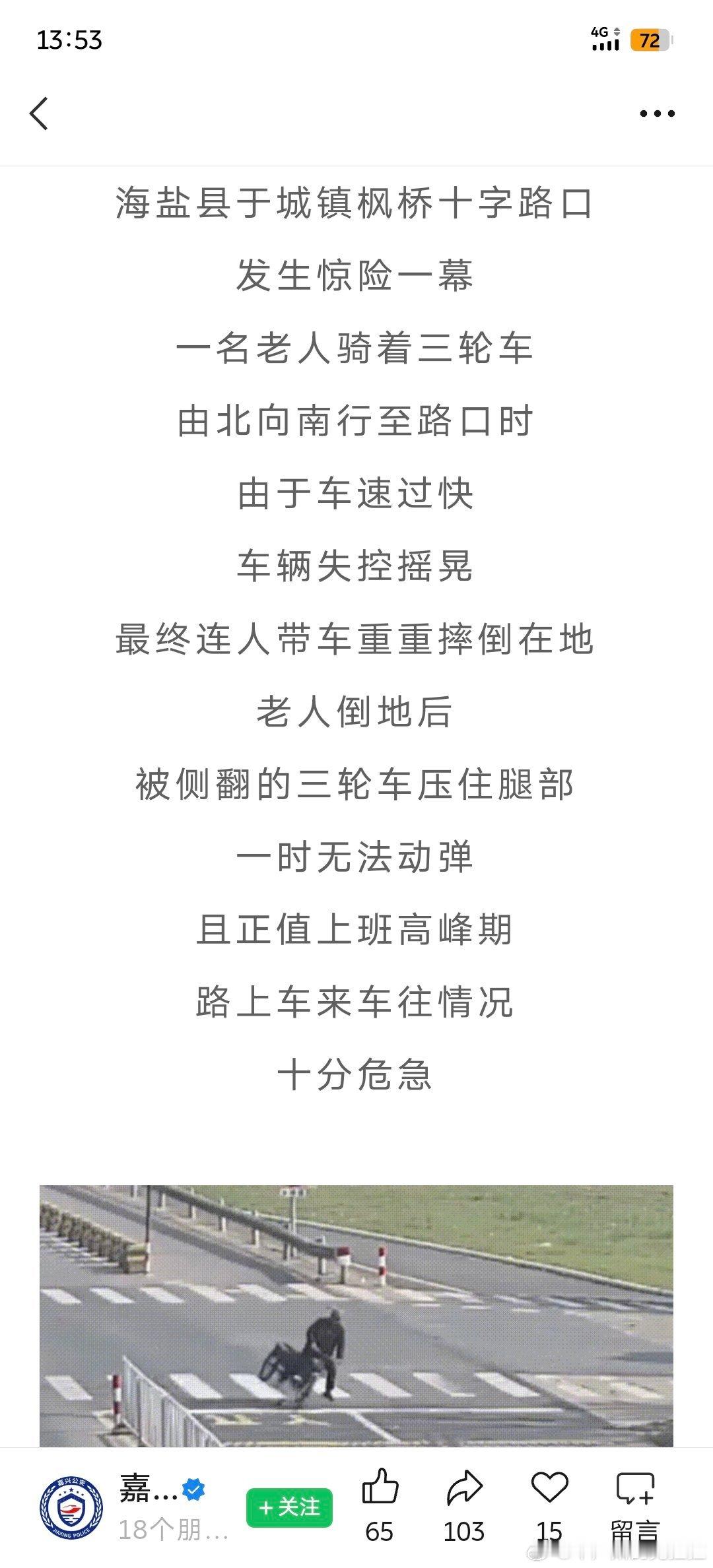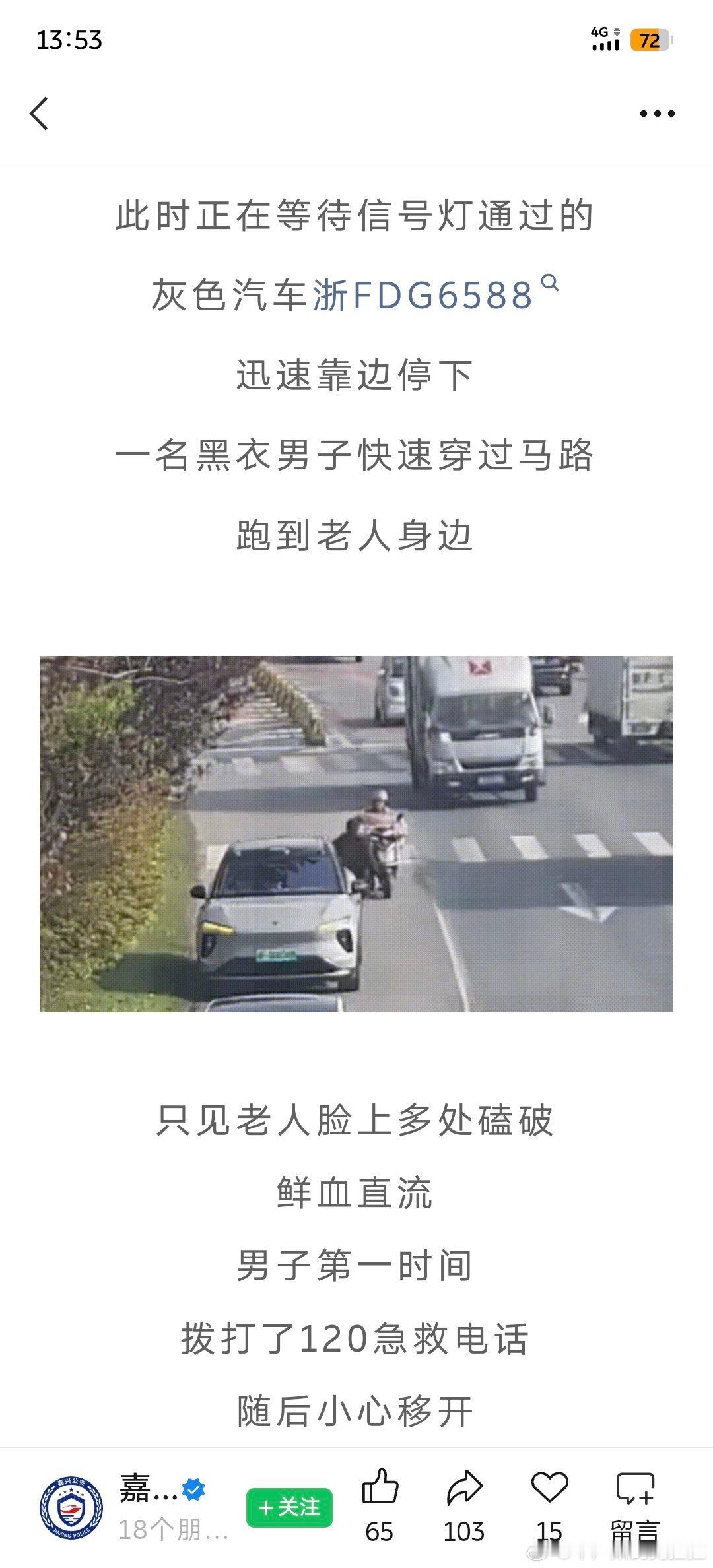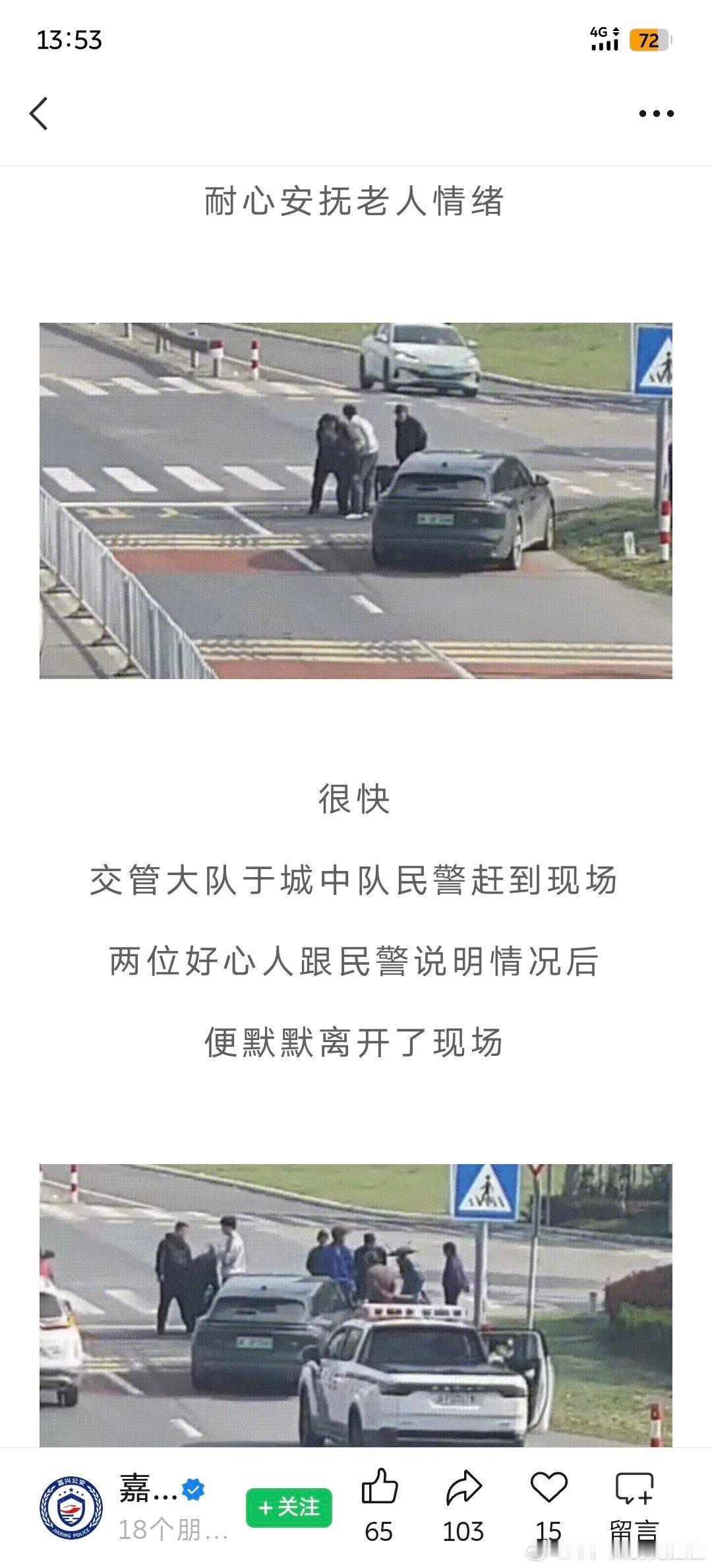 看到嘉兴交警公众号的一篇推文一位老人骑三轮车的过程当中摔倒了摔倒的位置在路口的正中央,且当时的情况是正值上班的早高峰两位蔚来车主在不妨碍交通的情况下选择了下车搀扶老人 并且报了警