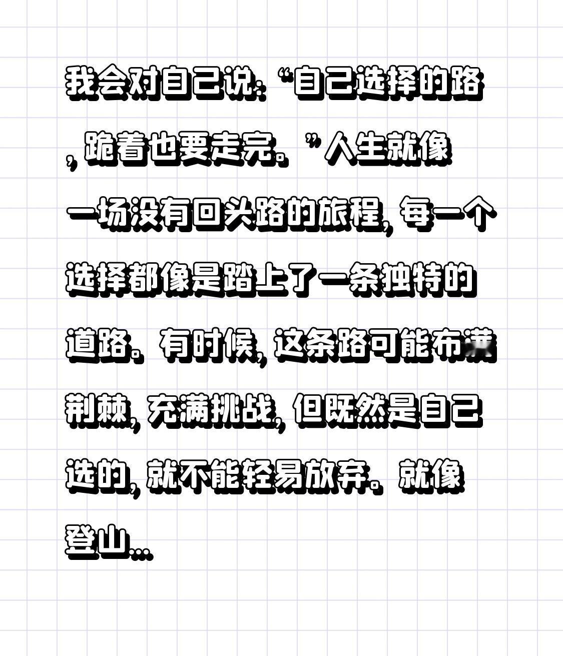 我会对自己说:“自己选择的路,跪着也要走完。”人生就像一场没有回头路的旅程,每一个选择都像是踏上了一条独特的道路。有时候,这条路可能布满荆棘,充满挑战,但既然是自己选的,就不能轻易放弃。就像登山者,明知山顶艰难,也会咬着牙坚持攀登。半途而废只会留下遗憾,而坚持下去,说不定就能看到别人看不到的风景。所以,别管前方有多少困难,坚定地走下去,因为只有这样,才能到达心中的目的地。