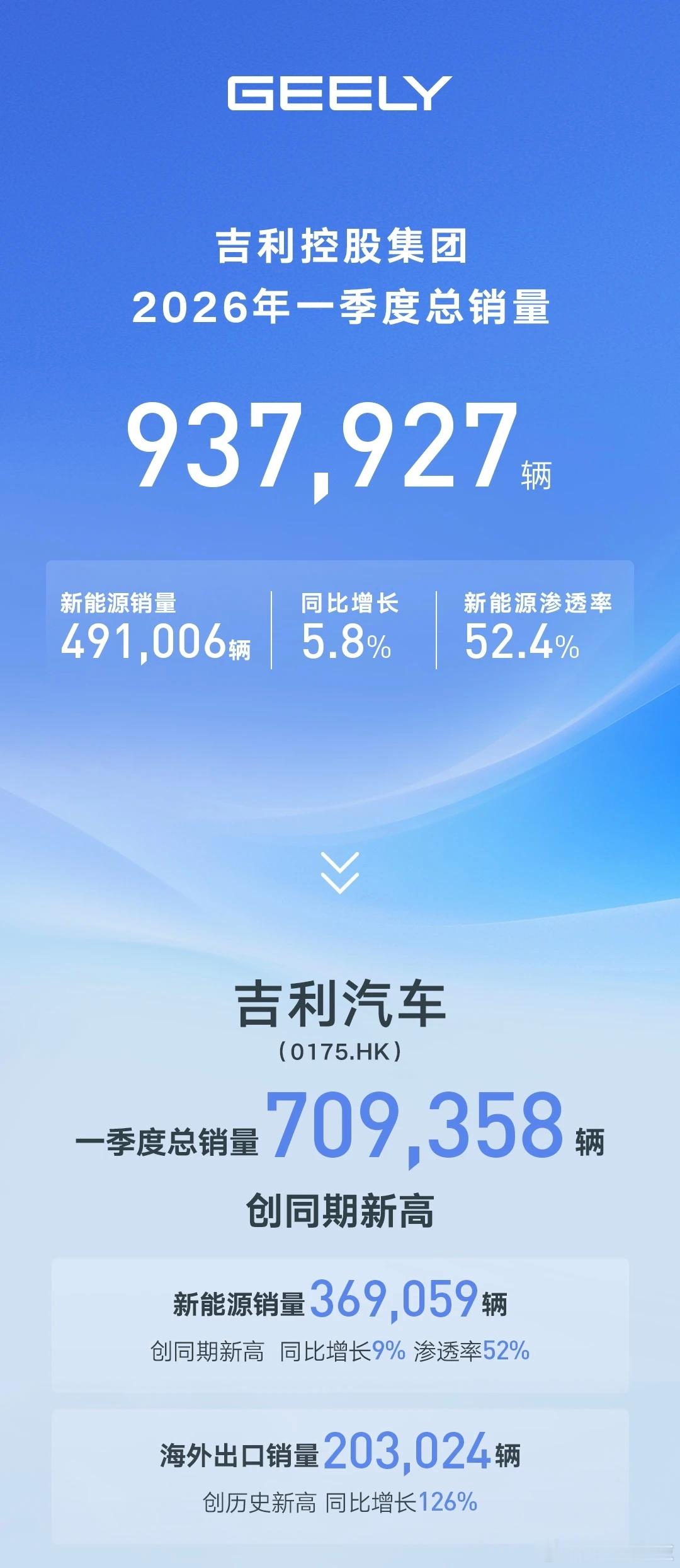 吉利控股2026Q1总销量超93.79万辆4月14日,吉利控股集团公布最新销量数据:2026 年一季度总销量 937,927辆;其中新能源销量491,006辆,同比增长 5.8%,新能源渗透率达 52.4%,新能源转型保持高质量增长态势,国际化与智能化进程全面提速,为实现全年经营目标奠定坚实基础。