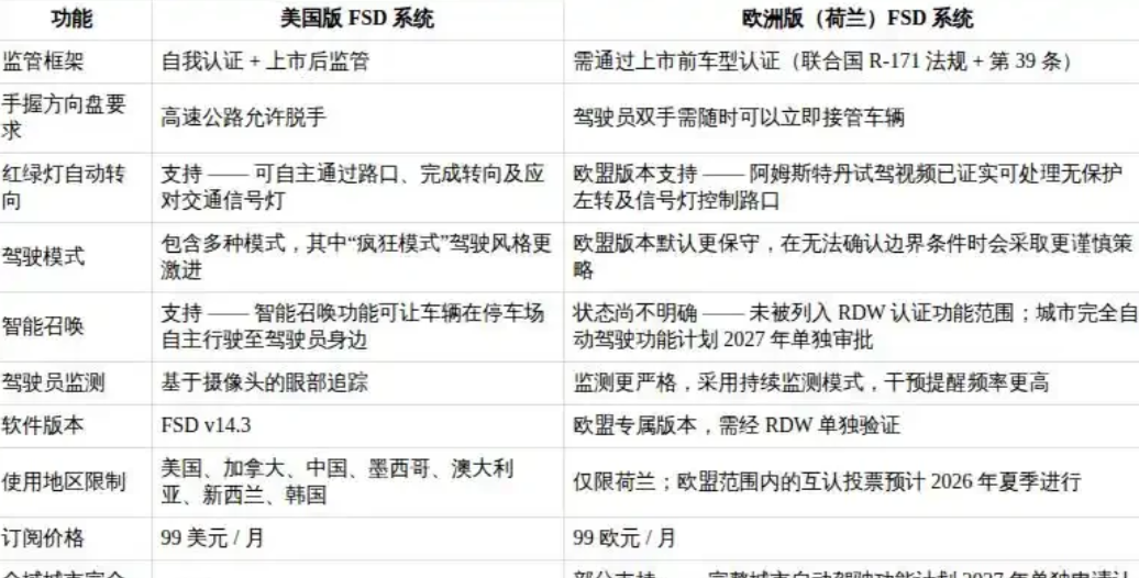 重点来了:欧洲版FSD和美国版并不是一回事,差别很大——美国允许高速脱手,欧洲不行;美国有“疯狂模式”,欧洲默认保守;智能召唤不在认证范围内,城市完全自动驾驶要到2027年单独审批。目前认证仅荷兰有效,订阅价99欧元/月。