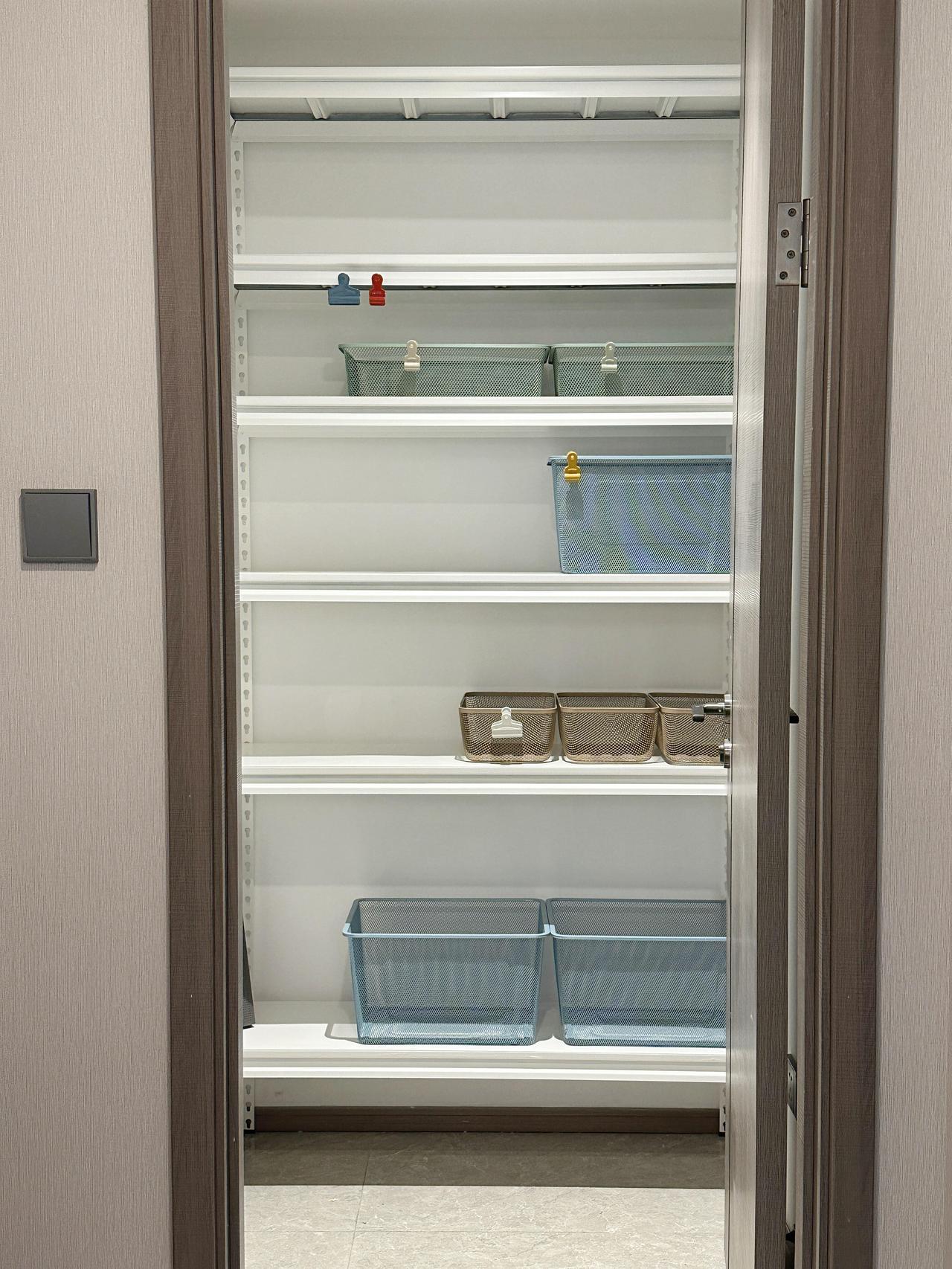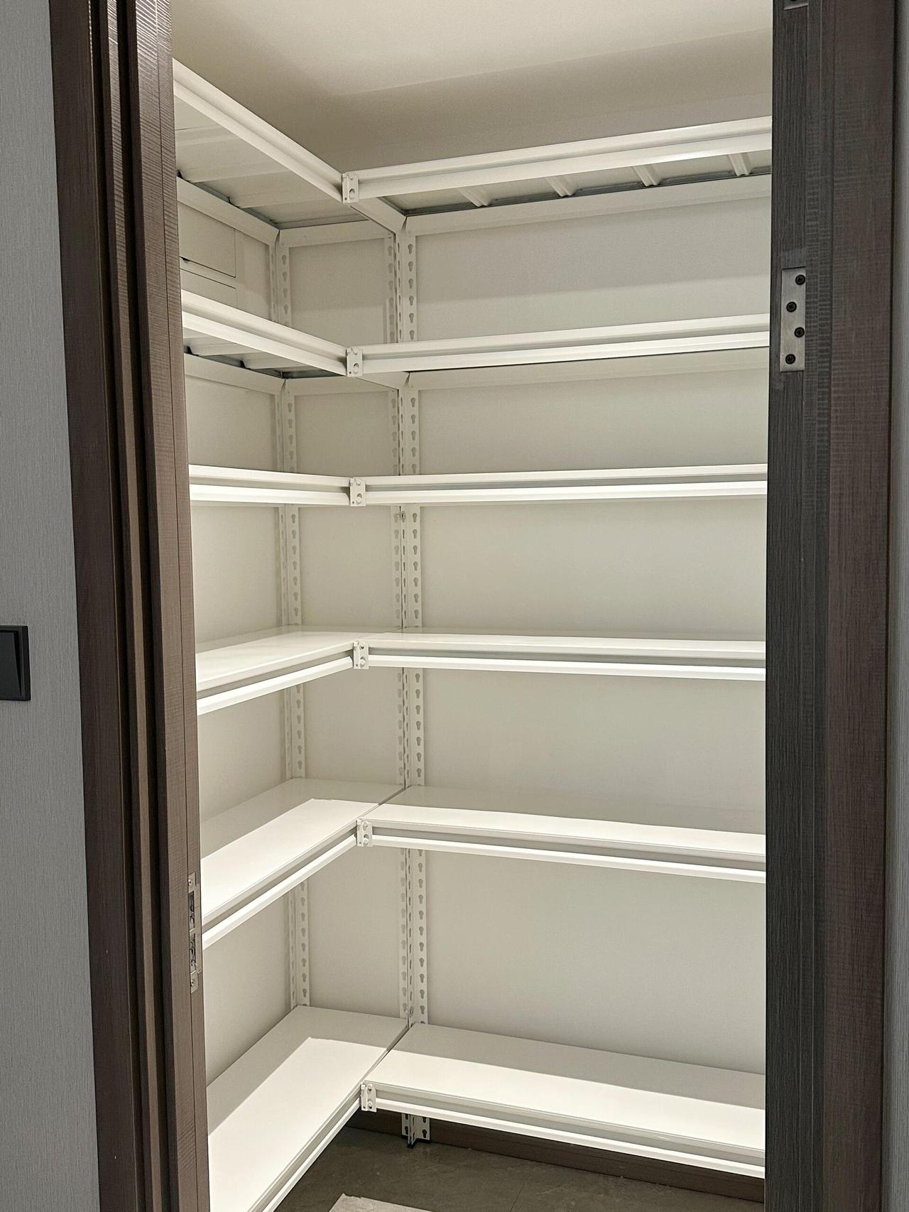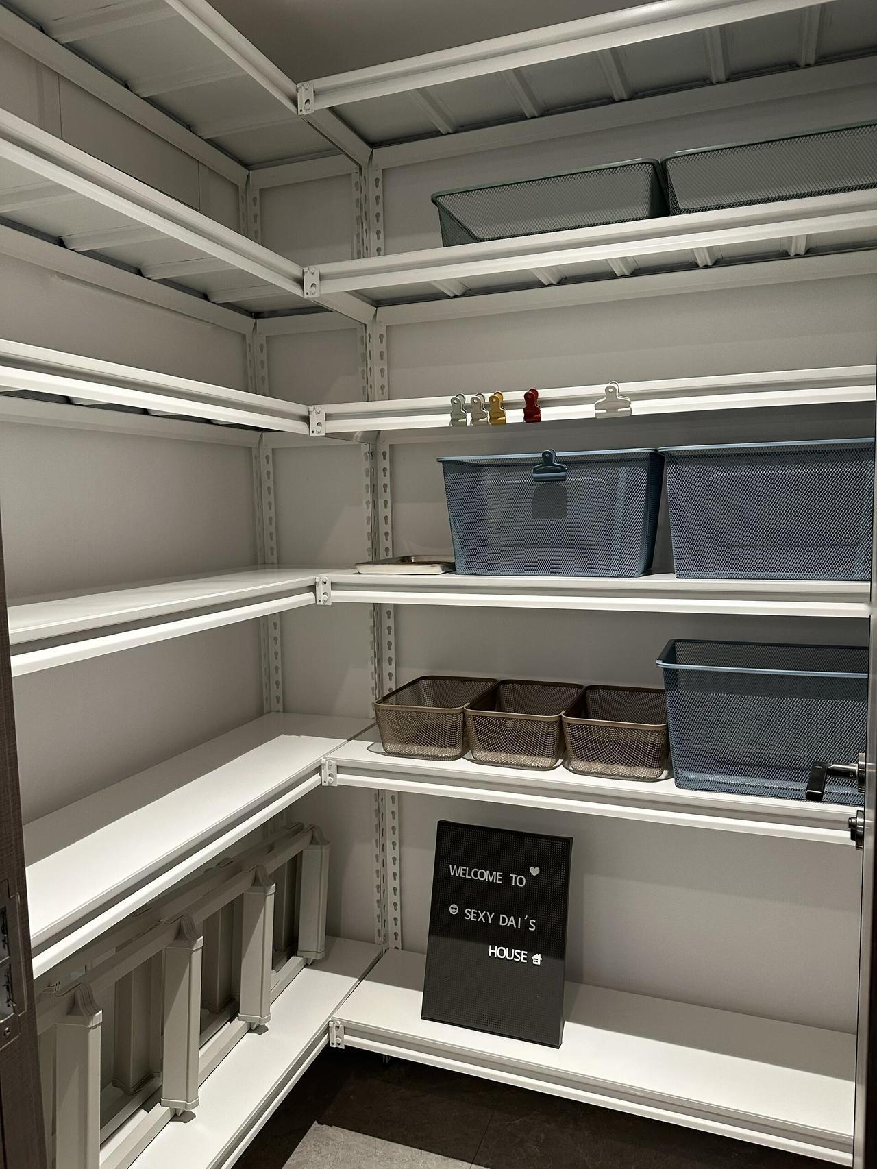 里面就用一组掐指一算L型货架,只需要几百块,选择白色显亮堂。家中大部分杂物都能收纳进去,能让家里干净整洁不少。