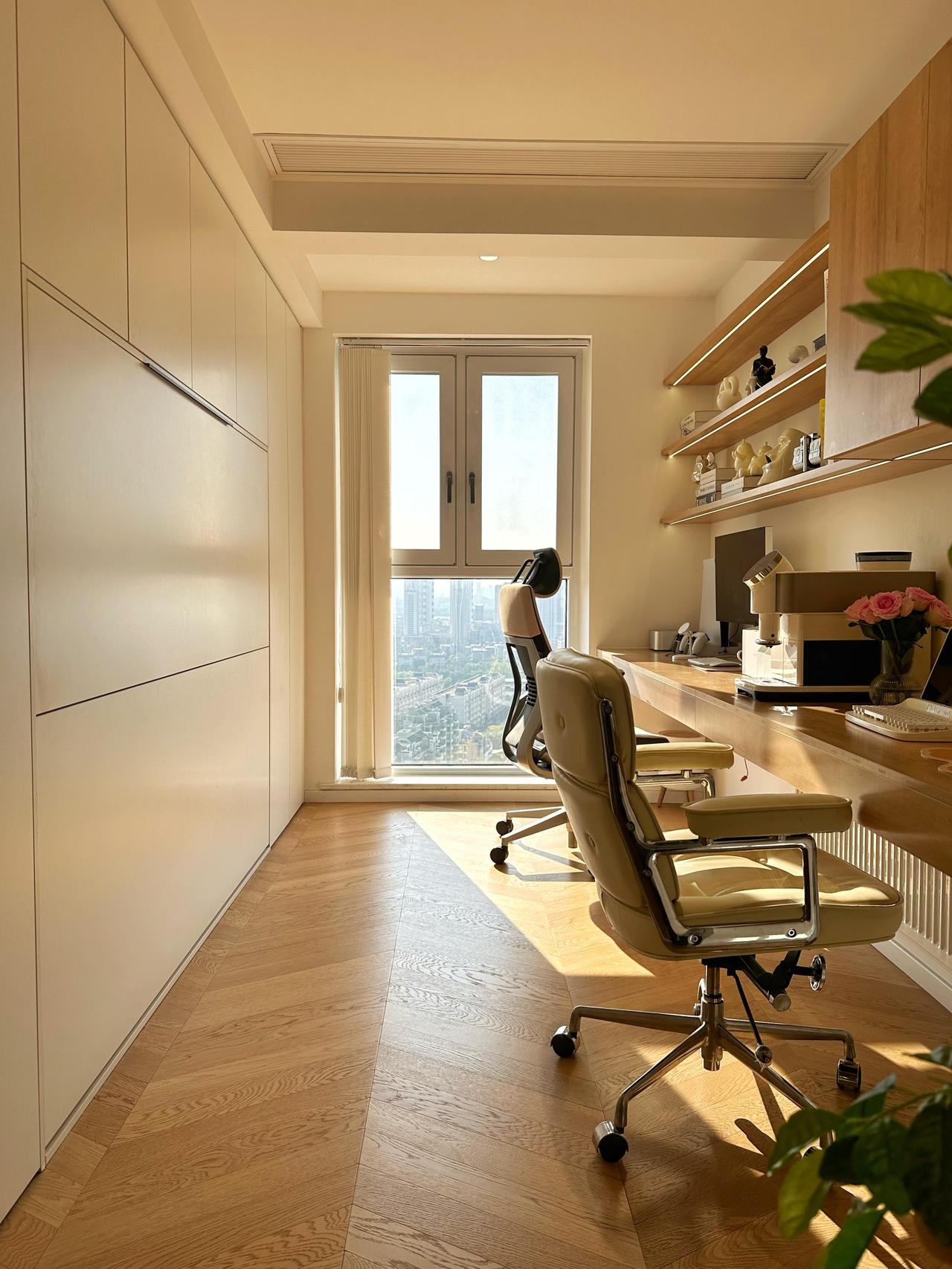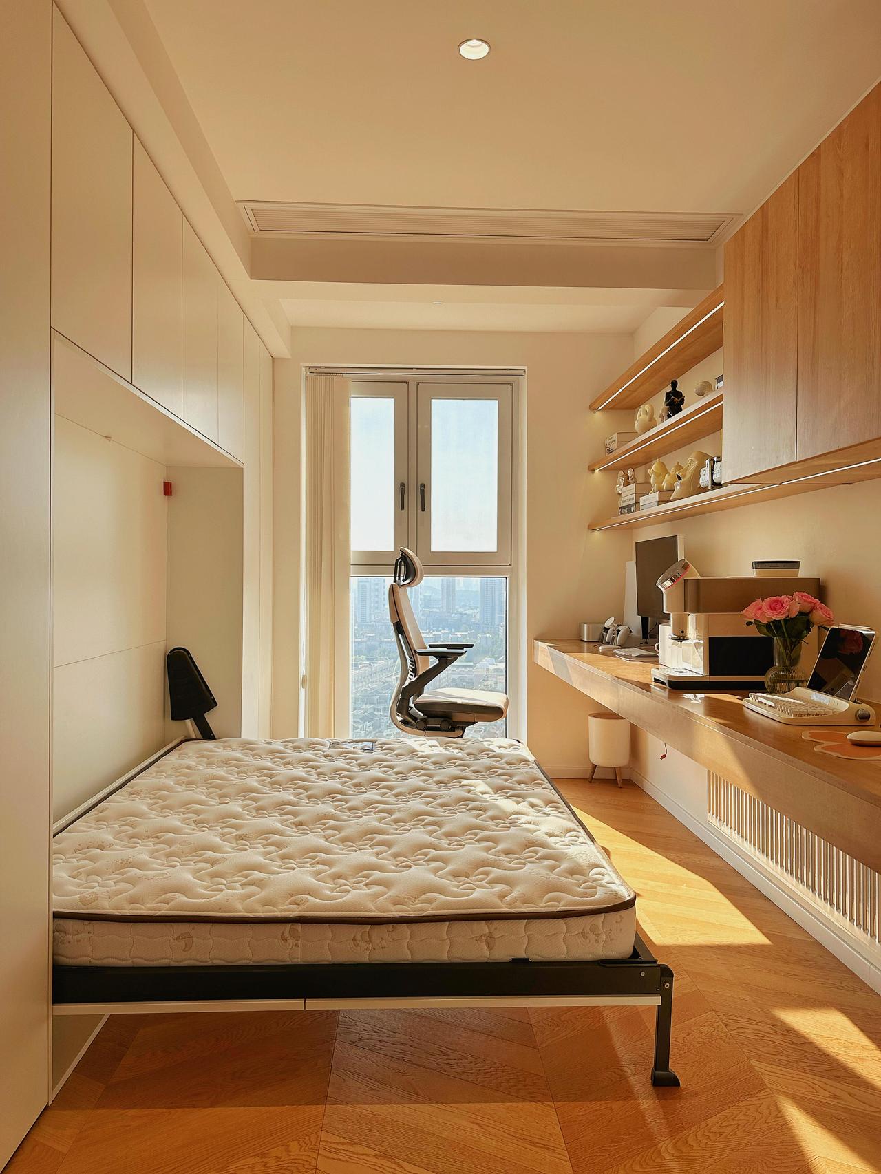 3、双人书房,3.6米的超长书桌,还有一整面的收纳柜和隐形折叠床,床不用的时候收起来,不占空间。