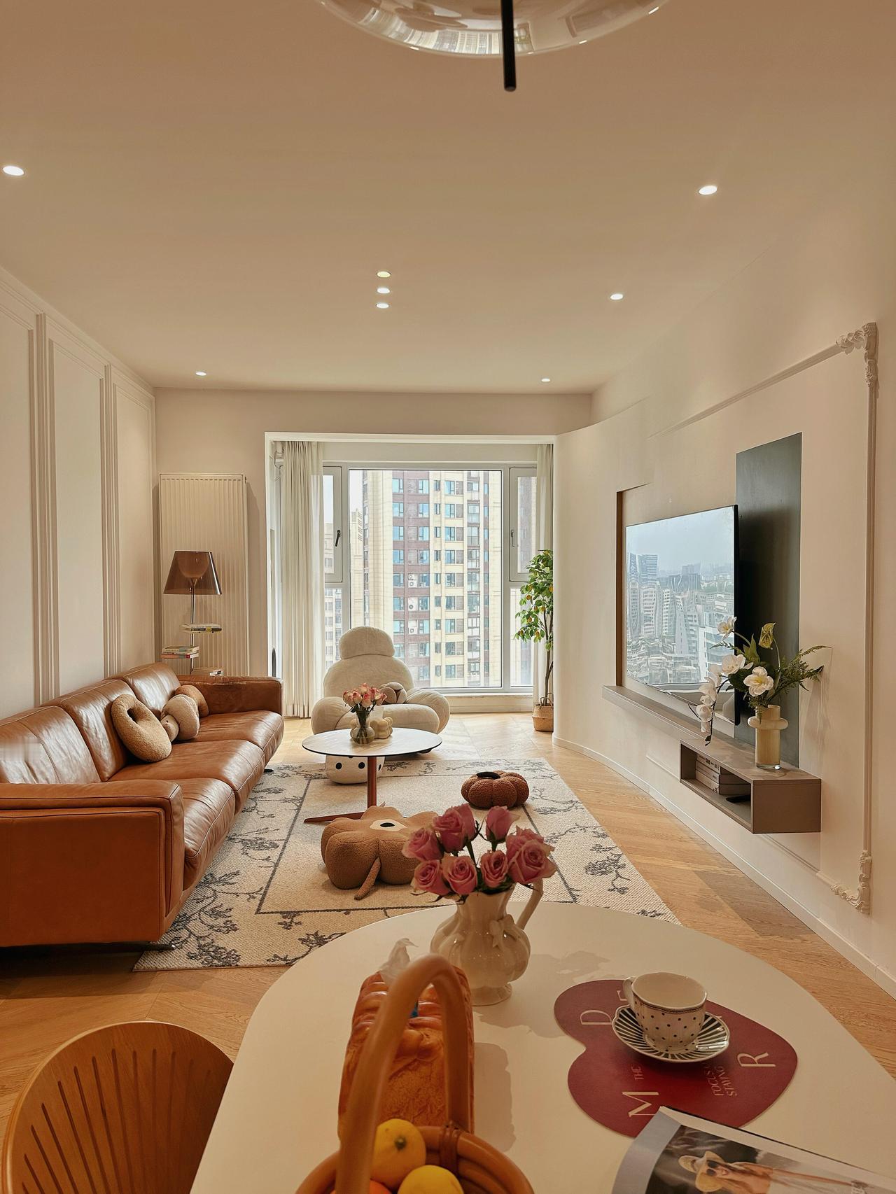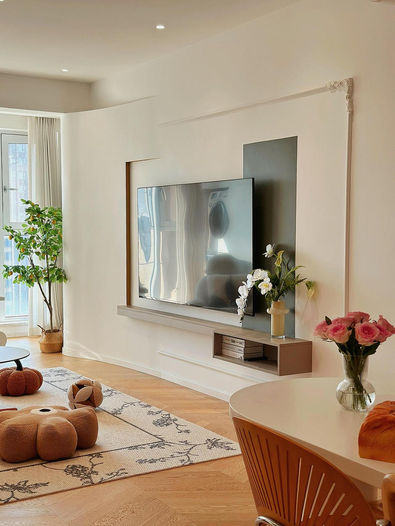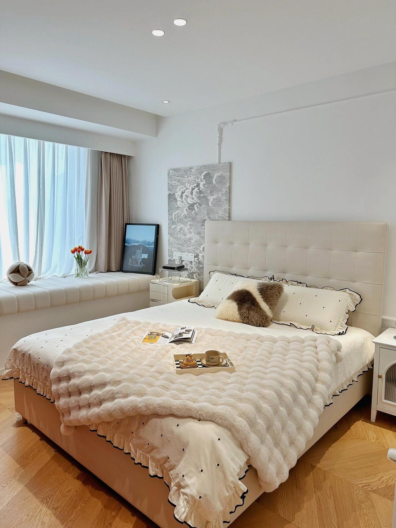 2、全屋大白墙+无主灯设计,通铺木地板,简单、温馨、好看。