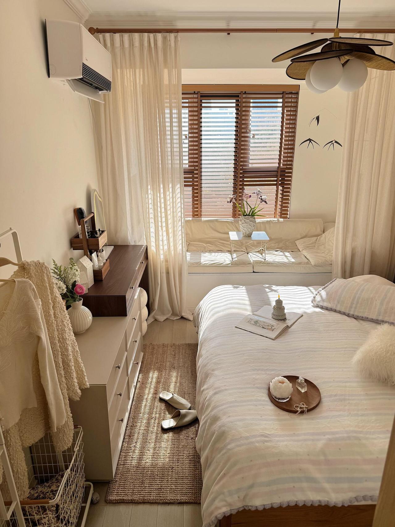 4、10平主卧室,1.8米的大床,随便躺平打滚都不挤,飘窗铺了软乎乎的垫子,平时晒晒太阳小憩超惬意。