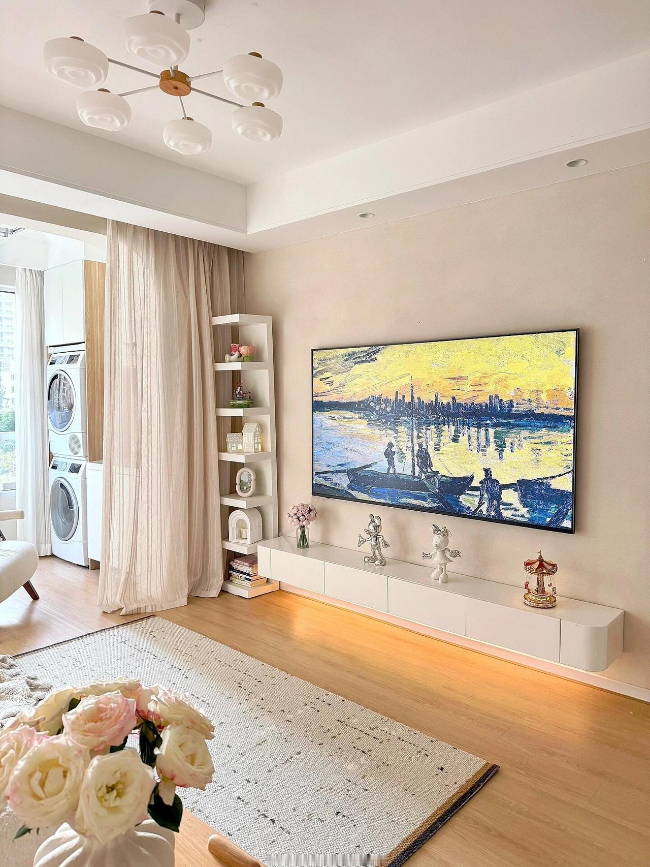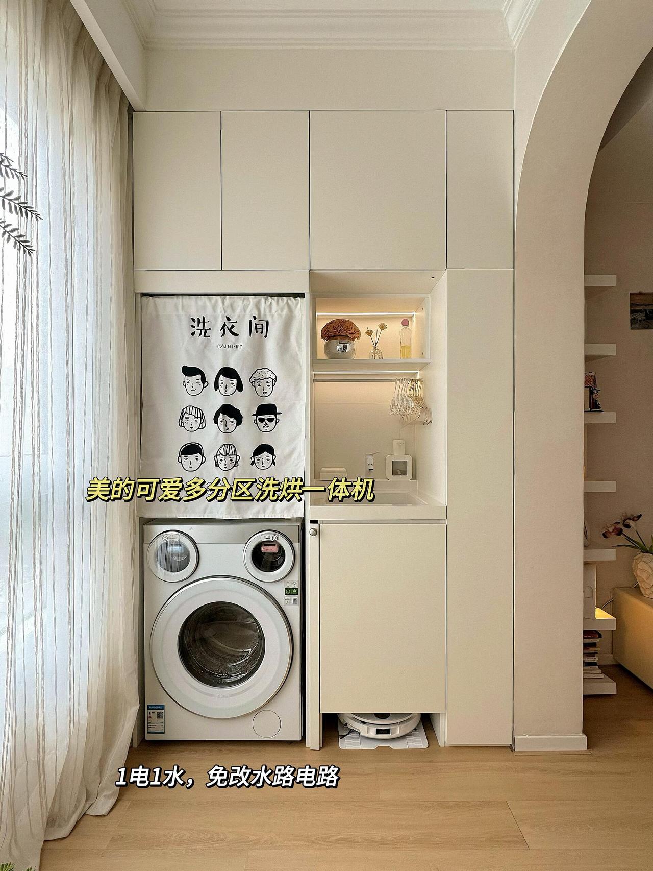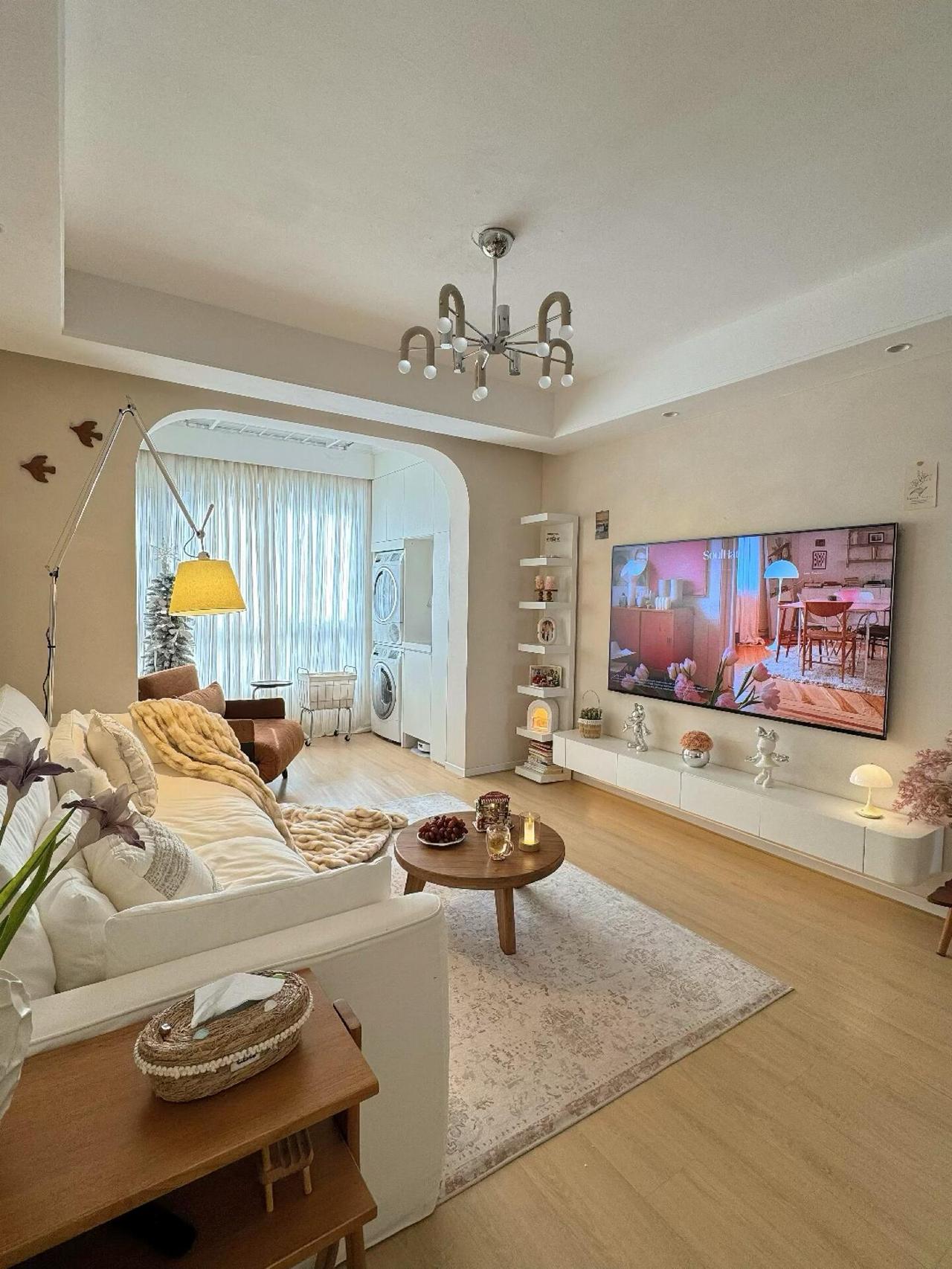 1、打通客厅阳台+餐厨一体,通透感拉满,阳台一面是镜面收纳柜,另一侧则是洗烘清洁区,没了杂乱晾晒,客厅看着都整洁很多!