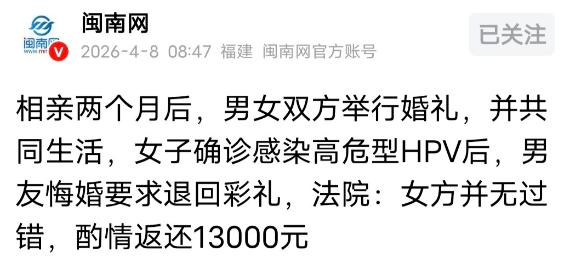 “不婚检的下场!”女子和男子相亲2个月,收了188000彩礼、四金,办了婚礼,同居生活,女子查出高危型HPV,男友怀疑女子有问题,对她变冷淡,甚至动手打她,拒绝领结婚证,直接悔婚,将女子告上法院,要求退还彩礼以及四金。法院判决让人唏嘘。
