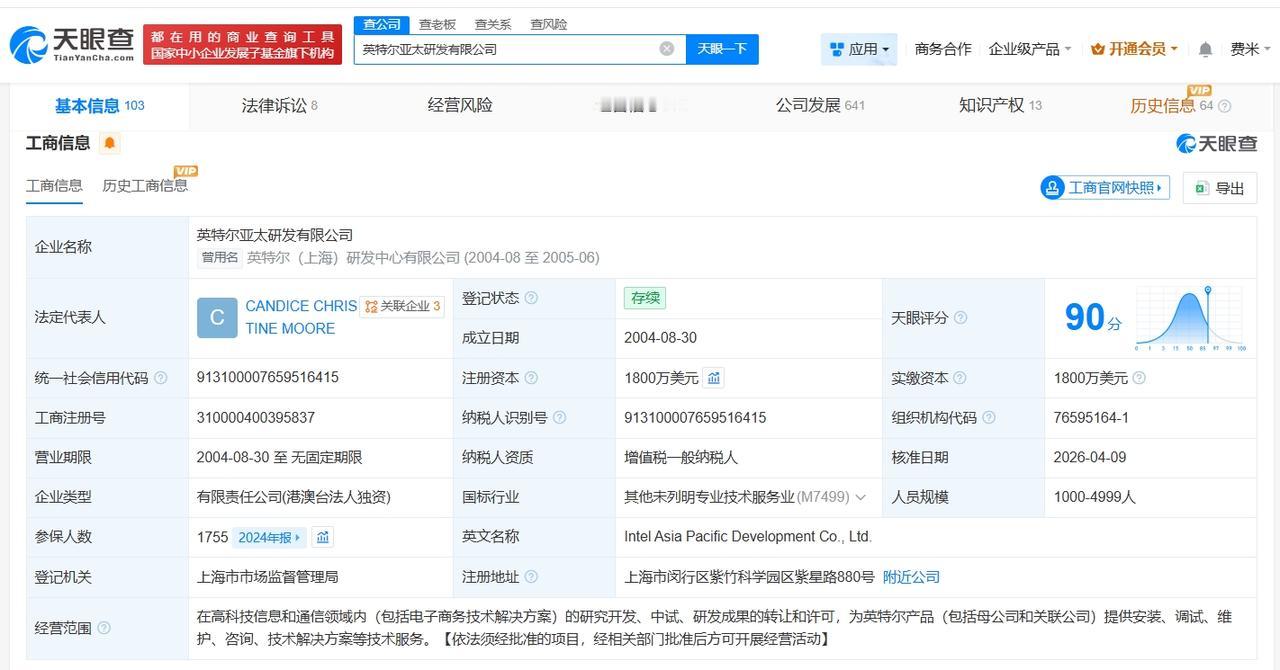 天眼查App显示,近日,英特尔亚太研发有限公司发生工商变更,HARRY HAROLD DEMAS卸任法定代表人、董事长,由CANDICE CHRISTINE MOORE接任。