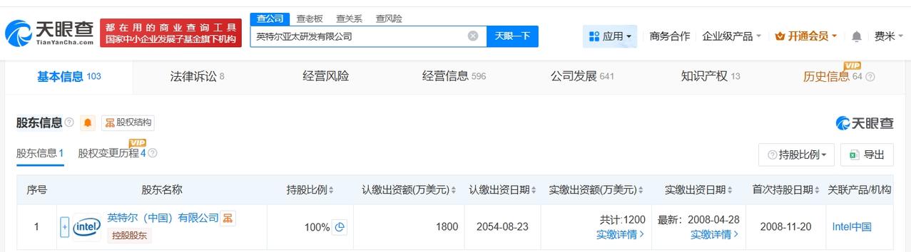 英特尔亚太研发公司董事长变更 英特尔亚太研发公司变更法定代表人 天眼查App显