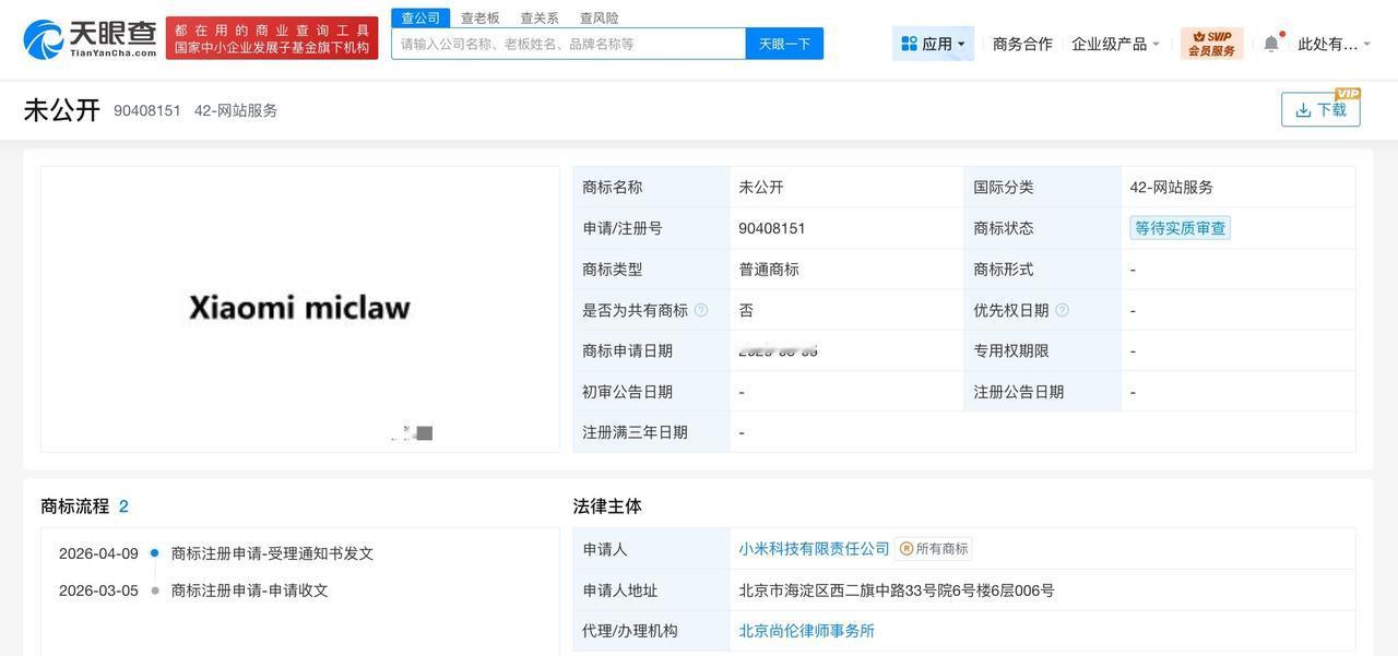 天眼查知识产权信息显示,近日,小米科技有限责任公司申请注册多枚“Xiaomi miclaw”商标,国际分类为科学仪器、网站服务,当前商标状态均为等待实质审查。
