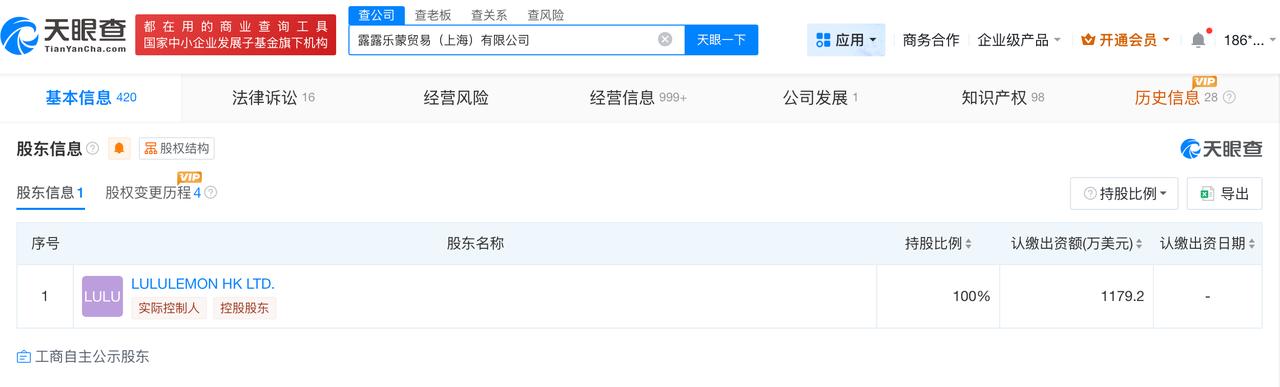天眼查App显示,Lululemon中国关联公司露露乐蒙贸易(上海)有限公司成立于2013年5月,法定代表人为NG SAN YAN,注册资本1179.2万美元,经营范围包括食品销售、餐饮服务、企业总部管理等。股东信息显示,该公司由LULULEMON HK LTD.全资持股。