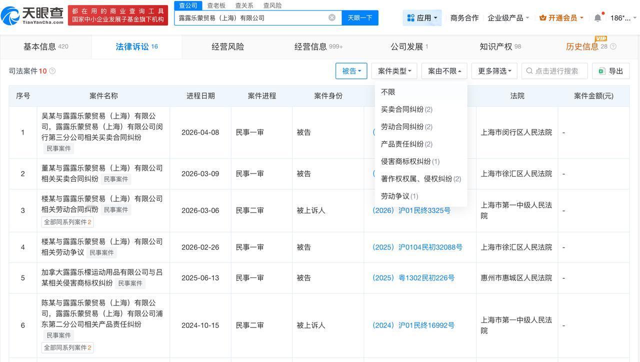 Lululemon关联公司涉多起纠纷 Lululemon拥有超160家分支机构