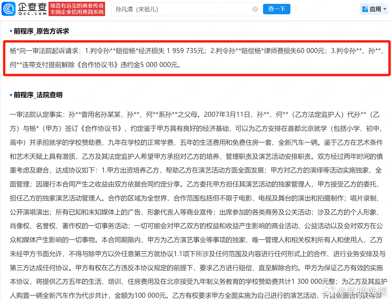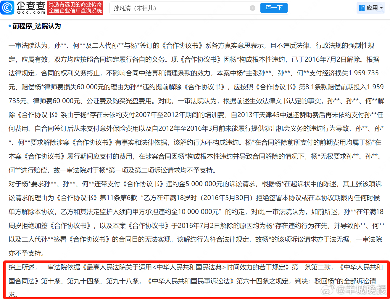【#宋祖儿被前经纪人索赔701万#】#宋祖儿曾被索赔701万#企查查APP显示,近日,宋祖儿刘宇宁恋情事件持续发酵,宋祖儿官方后援会连发数文,控诉工作室对艺人维护不作为、慢作为,多次错失谣言处理时机,承诺未兑现、无有效处理结果,宣布即日起暂停运营。企查查APP显示,宋祖儿早年曾遭前经纪人杨钧起诉合同纠纷。杨钧将宋祖儿(本名孙凡清)及其父母孙怀忠、何旭军诉至法院,索赔总额701万余元,包括合作违约金 500万元、律师费6万元及经济损失195.97万余元。2007年3月,杨钧与未成年宋祖儿及其监护人签订15年合作协议,约定孙凡清在合同期内未经杨钧同意,不得与任意第三方进行演艺等方面的合作,同时约定杨钧负责其就学、住房、购车、培训费及演艺事务管理。后双方产生纠纷,宋祖儿一方于2016年7月发函解除合同。法院查明,依据有关生效裁判认定,杨钧在涉案合同中的确在宋祖儿教育、培训等方面投入了支出、提供了便利,同时,其也为宋祖儿提供了演艺机会,相关收入与报酬也按照合同约定由杨钧收取。但是,依据既有生效裁判认定,杨钧在涉案合同中存在违约行为,且为先违约一方,违约行为主要包括未依约支付2007年至2012年期间的培训费、自2013年天津45中退还赞助费后再未依约支付宋祖儿任何费用、自合同签订后从未支付意外保险费用以及自2012年至2016年3月前未能履行提供演出机会义务,由此导致宋祖儿行使合同解除权,法院一审驳回杨钧全部诉讼请求,杨钧上诉后,二审维持原判。更多消息:#罗志祥方否认猝死传闻##胡巴每年都给井柏然过母亲节##王星和女友回应不结婚的原因##宋祖儿被男粉求婚##网友评业内男明星咖位#(编辑:杨雨桐;审签:谢杨柳)