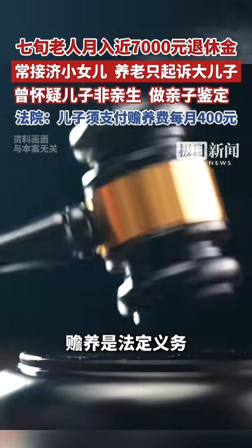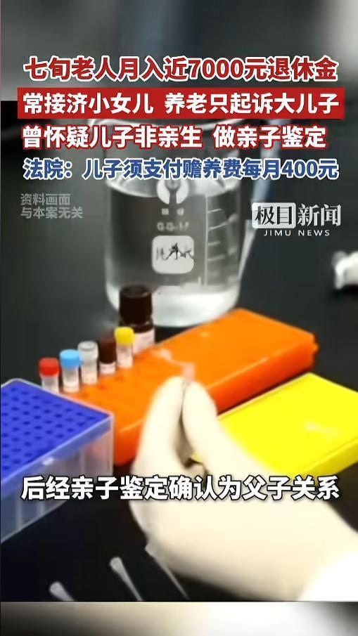 信息来源:《七旬老人月入近7000元退休金,常接济小女儿,养老只起诉大儿子,曾怀疑儿子非亲生做亲子鉴定,法院:儿子须支付赡养费每月400元》极目新闻
