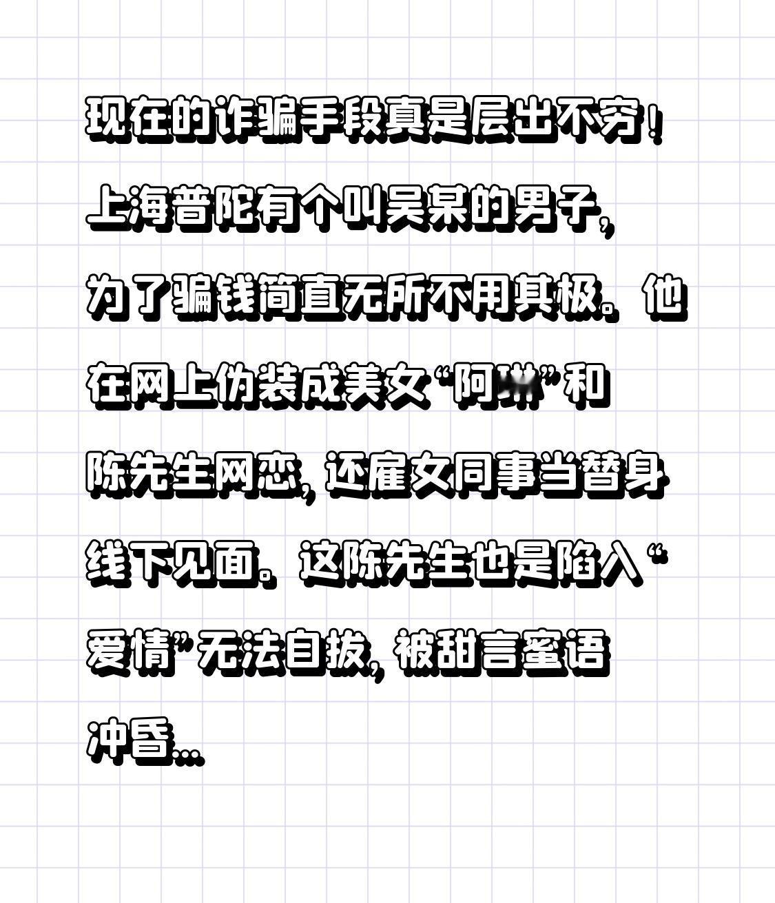 现在的诈骗手段真是层出不穷!上海普陀有个叫吴某的男子,为了骗钱简直无所不用其极。他在网上伪装成美女“阿琳”和陈先生网恋,还雇女同事当替身线下见面。这陈先生也是陷入“爱情”无法自拔,被甜言蜜语冲昏了头,不仅拿出全部积蓄,还四处贷款,前前后后给吴某转了100多万。等吴某拿到钱直接失联拉黑,陈先生才如梦初醒。目前吴某已被刑拘,钱却早被他挥霍一空。大家网恋可得擦亮眼睛,别被虚幻的爱情冲昏头脑,让骗子钻了空子!