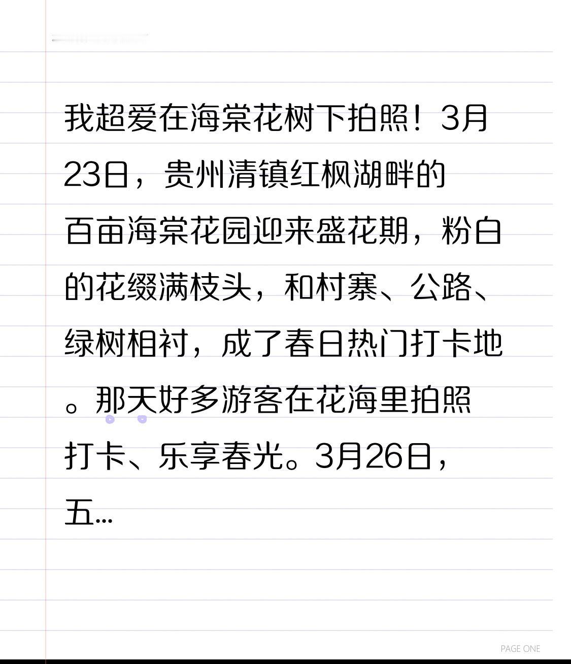 我超爱在海棠花树下拍照!3月23日,贵州清镇红枫湖畔的百亩海棠花园迎来盛花期,粉白的花缀满枝头,和村寨、公路、绿树相衬,成了春日热门打卡地。那天好多游客在花海里拍照打卡、乐享春光。